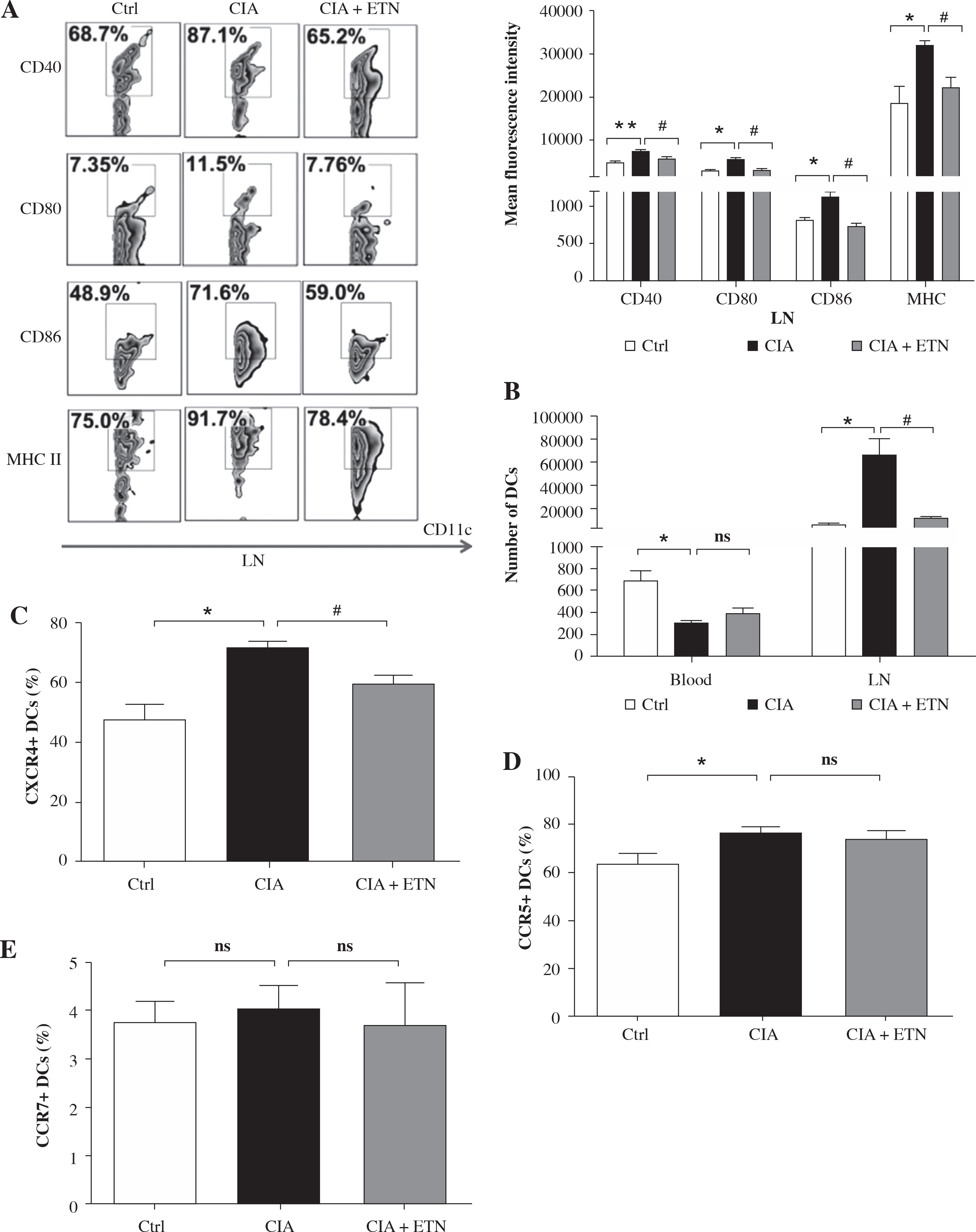 ETN treatment inhibited DC maturation and migration in CIA mice. Single-cell suspensions were prepared from the mouse LNs of three groups. A) The changes of mean fluorescence intensity of CD40, CD80, CD86 and MHC II (I-Aq) were analyzed. B) ETN treatment reduced the absolute number of DCs in LNs. C-E) Effects of ETN treatment on CXCR4, CCR5 and CCR7 expression on DCs of peripheral blood in mice. NS, p > 0.05; *p < 0.05, ** p < 0.01 was for the comparison between the healthy control mice and the saline-treated CIA mice, # p < 0.05 was for the comparison between the CIA + ETN group and CIA mice (n = 6)