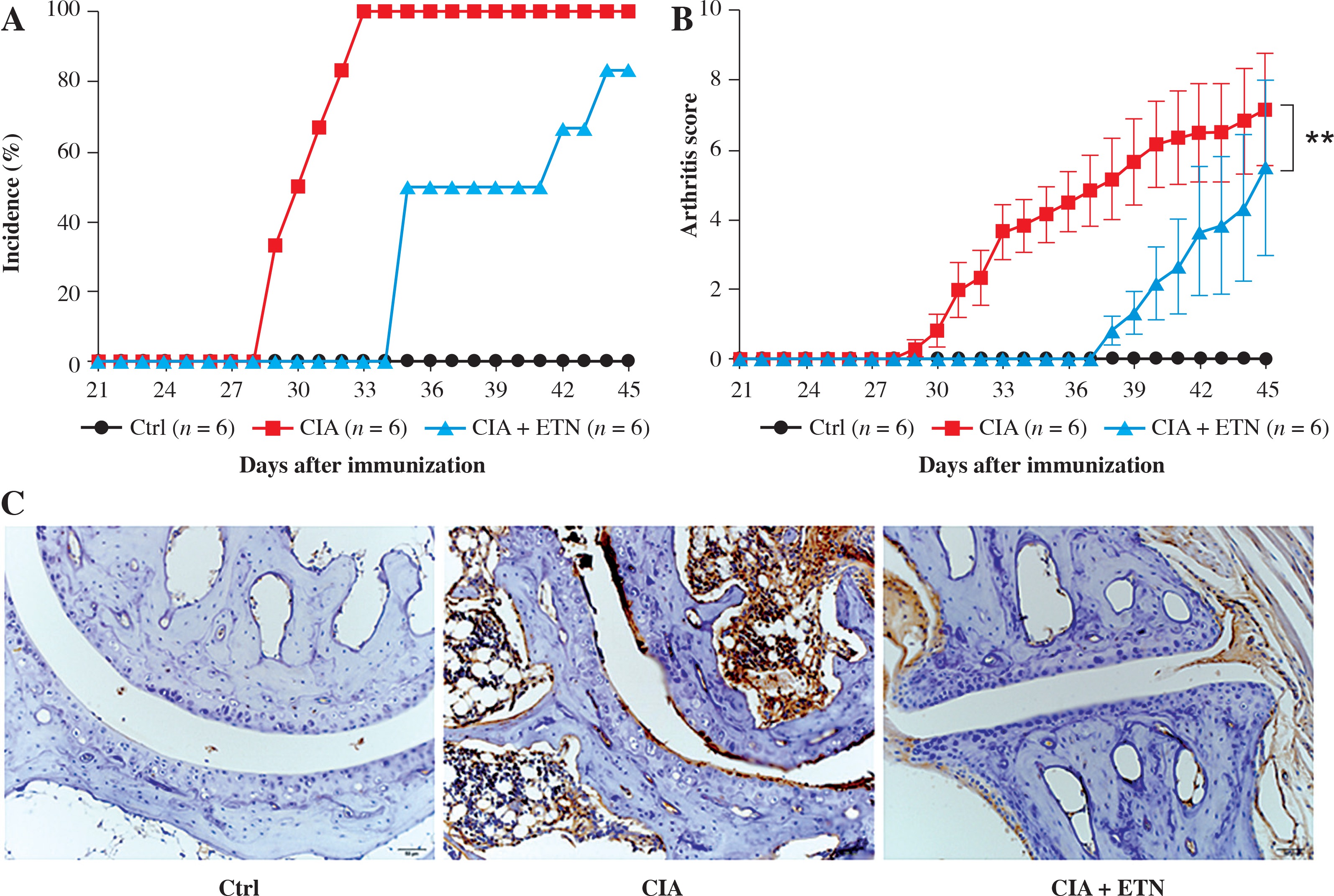 Mice were divided into the control group, CIA group (arthritic mice injected with saline), and ETN + CIA group (CIA mice intraperitoneally injected with 5 mg/kg ETN every 3 days from day 21 to 45).