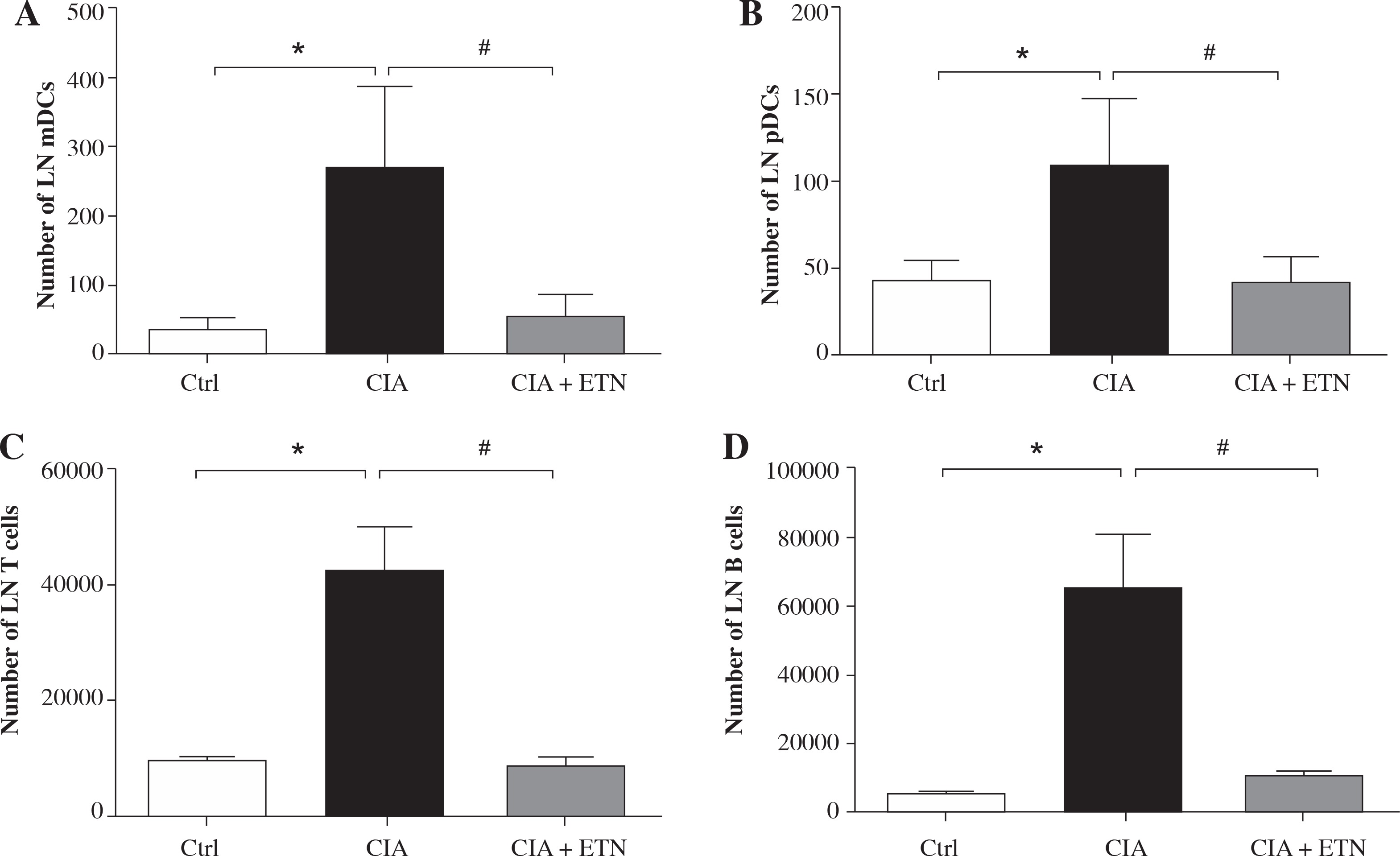 ETN changed DC subsets and cellular composition of LNs in the CIA model. A, B) ETN treatment significantly reduced the number of mDCs (B220-CD11b+) and pDCs (B220+PDCA+) in the LNs. C, D) The absolute number of T cells (CD3+ CD11c+) and B cells (CD19+ CD11c+) in LNs of mice were analyzed by flow cytometry. * p < 0.05 was for the comparison between the healthy control mice and the saline-treated CIA mice, # p < 0.05 was for the comparison between the CIA + ETN group and CIA mice (n = 6)
