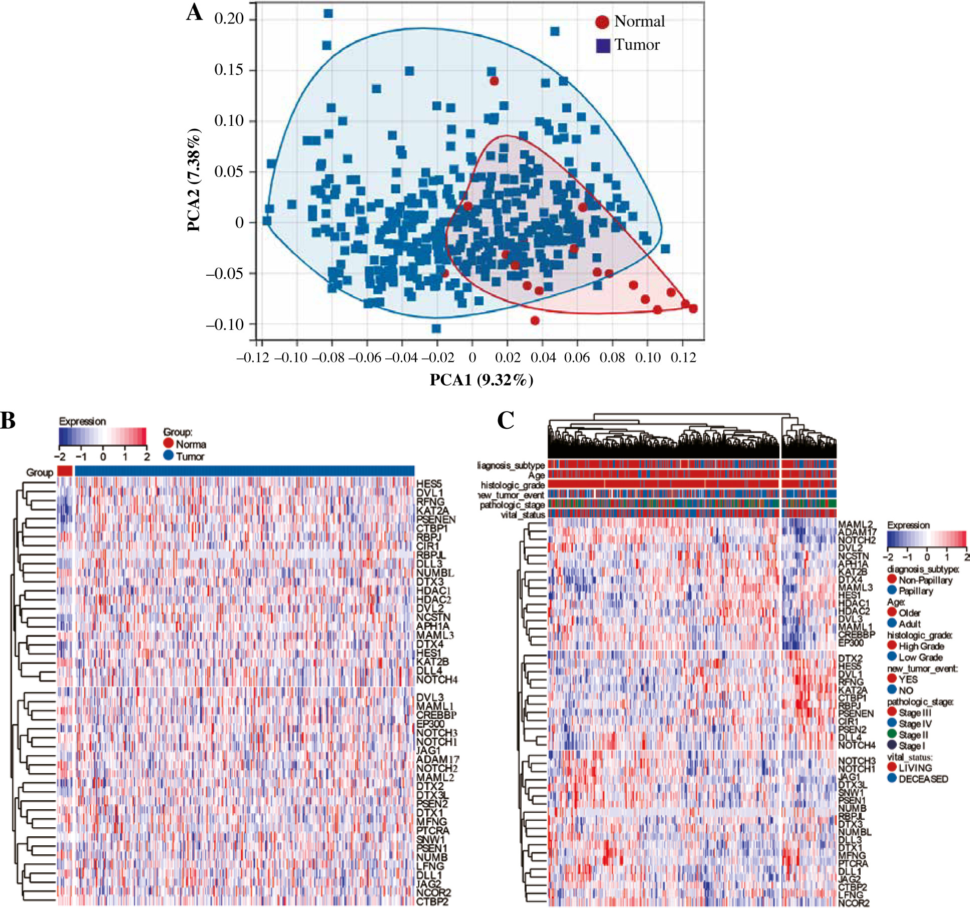 First, we performed PCA analysis for the bladder cancer dataset from TCGA. An outlier sample was rejected from the normal group (Fig. 1A) and the other samples were further analyzed. We found that the expression pattern of NRGs was different between normal samples and BC samples. RFNG, KAT2A, PSENEN, APH1A, NCSTN, DTX4, DTX2, NOTCH3 were highly expressed in BC, while MAML3, KAT2B, MAML1, CREBBP, NOTCH1, NOTCH2, MAML2, NOTCH4, DLL1, DLL4 were low expressed (Fig. 1B). Next we further analyzed the NRG expression patterns according to different clinical features, and we found that the MAML2, ADAM17, NOTCH2, DVL2, NCSTN, APH1A, KAT2B, DTX4, MAML3, HES1, HDAC1, HDAC2, DVL3, MAML1, CREBBP, EP300 genes were highly expressed in non-papillary bladder cancer, elderly patients, histologically high grade, recurrent, pathologically high grade and deceased patients; however, DTX2, HES5, DVL1, RFNG, KAT2A, CTBP1, RBPJ, PSENEN, CIR1, PSEN2, DLL4, NOTCH4 genes showed low expression, while NOTCH3, NOTCH1, JAG1, DTX3L, DTX3L, SNW1, PSEN1, NUMB, RBPJL, DTX3, NUMBL, DLL3, DTX1, MFNG, PTCRA, DLL1, JAG2, CTBP2, LFNG, NCOR2 did not differ significantly among the different clinical features (Fig. 1C).