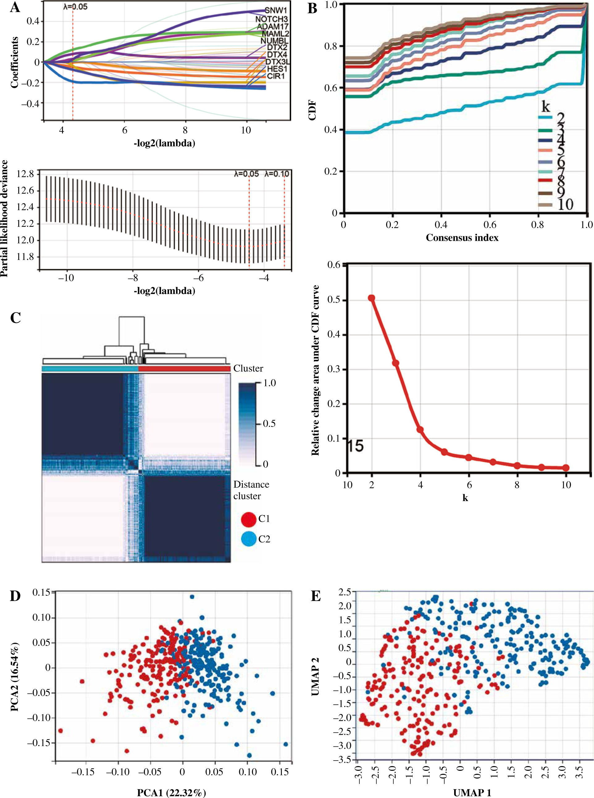 Clustering analysis of bladder cancer based on Notch-related gene expression profiling. A) Lasso-Cox regression analysis and partial likelihood deviance for the Lasso regression. B) Consensus cumulative distribution function (CDF) plot and delta area (change in CDF area) plot of K from 2 to 5. C) Consensus clustering matrix for k = 2. D) PCA analysis confirmed the classification. E) UMAP analysis confirmed the classification.