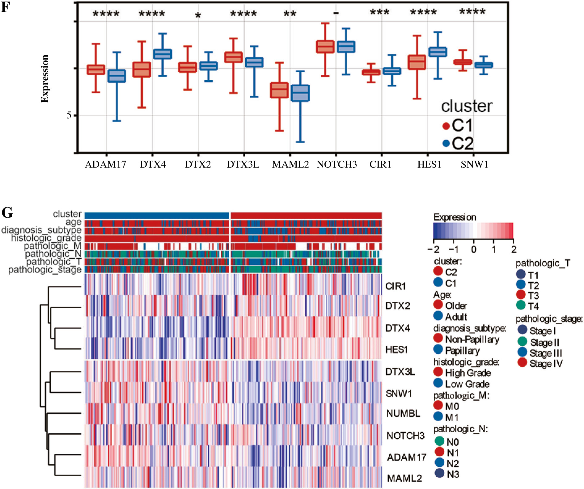 We analyzed these genes according to survival time by Lasso and set the lambda value at 0.0501732887259597. Finally, we obtained 10 genes closely related to survival time: SNW1, NOTCH3, ADAM17, MAML2, NUMBL, DTX2, DTX4, DTX3L, HES1, CIR1 (Fig. 2A). Based on the expression levels of these 10 genes, optimal clustering stability was achieved when K = 2 (Fig. 2B); all patients with bladder tumors could be divided into 2 subtypes: C1 (n = 199) and C2 (n = 208) (Fig. 2C). After UMAP analysis and PCA analysis of these two subtypes, it was found that this typing method was able to clearly distinguish the two groups of patients with bladder cancer (Fig. 2D, E). Further analysis showed differences in the expression patterns of these 10 genes in C1 and C2 (Fig. 2F, G), with six genes (ADAM17, DTX3L, MAML2, SNW1, NOTCH3, NUMBL) significantly upregulated in C1; four genes (DTX4, DTX2, CIR1, HES1) were significantly down-regulated in C1.