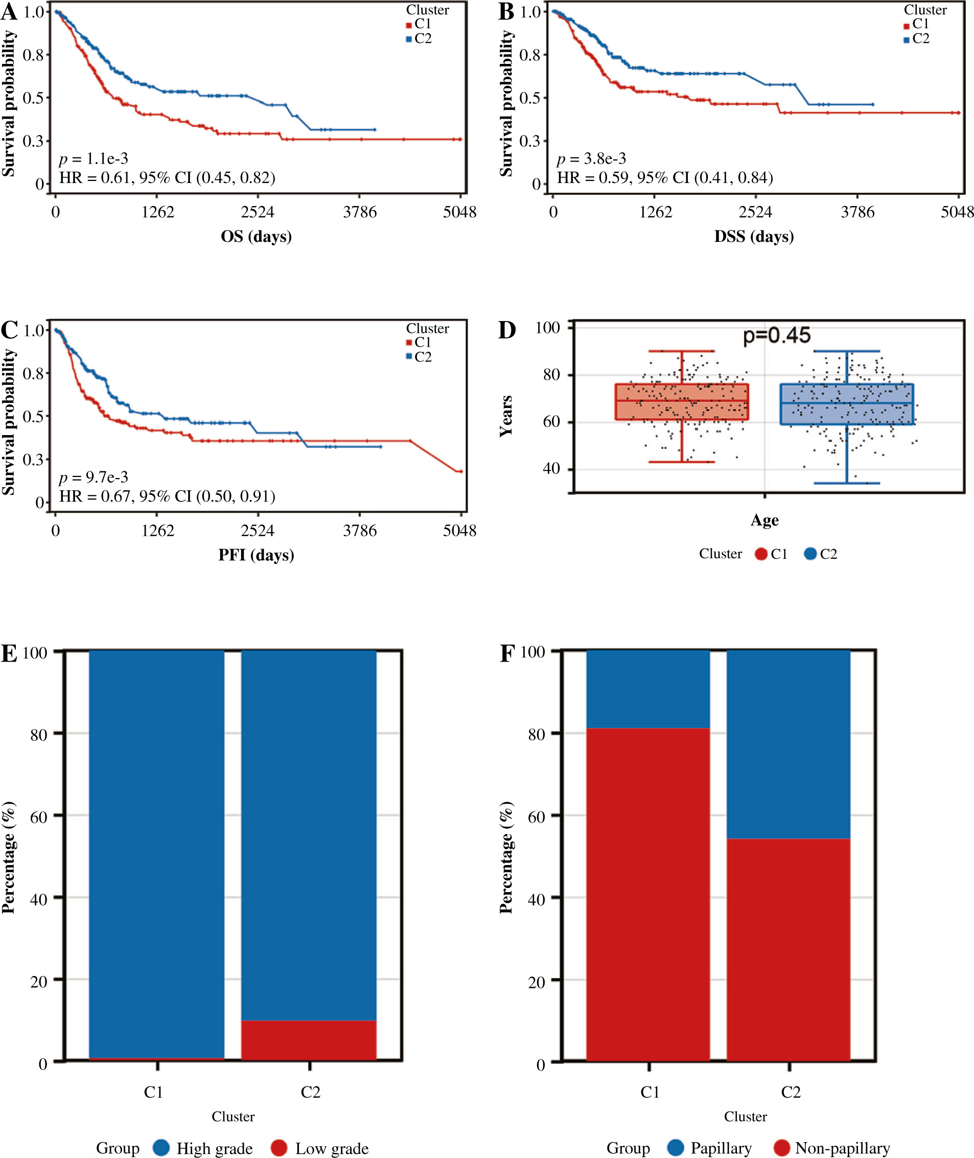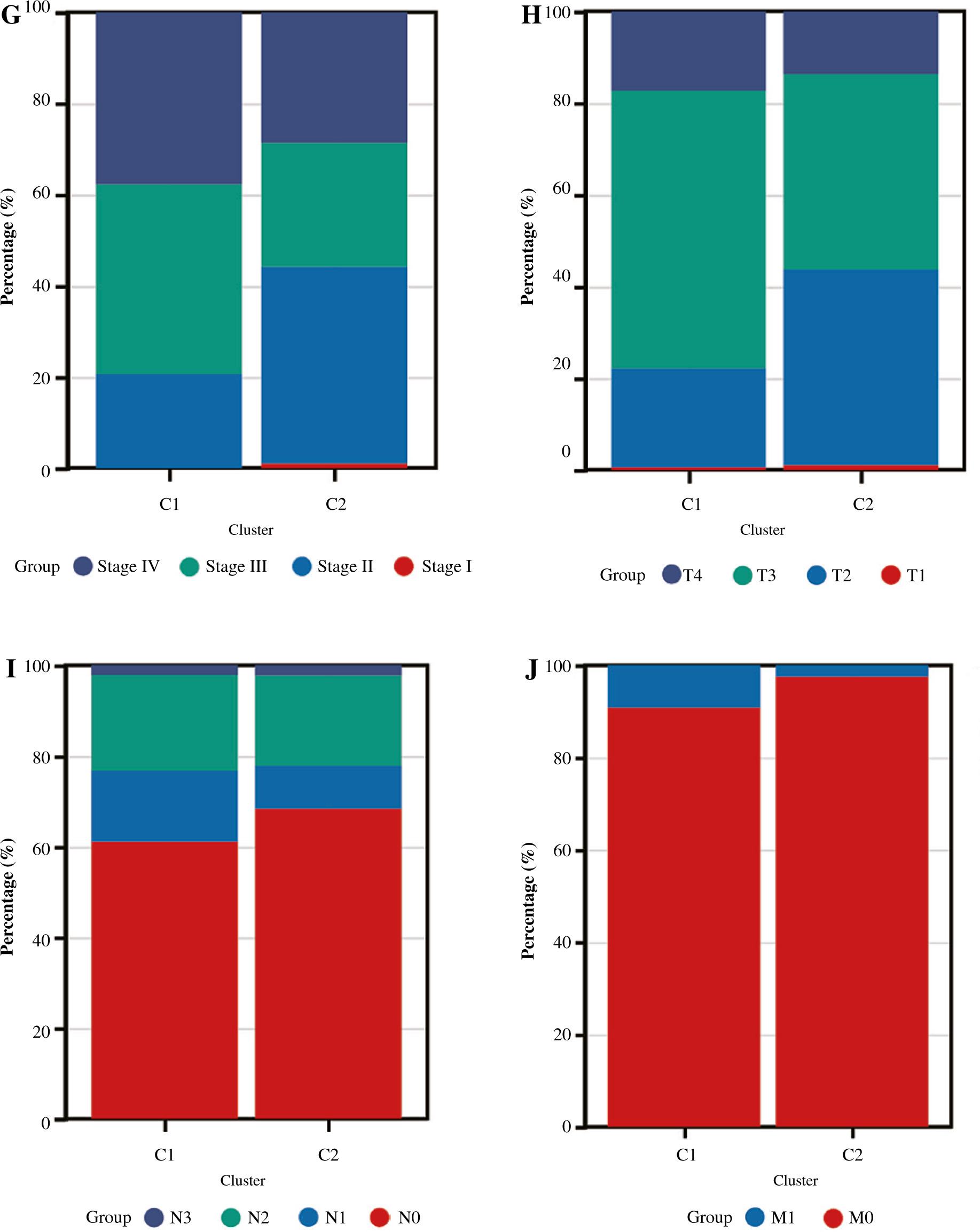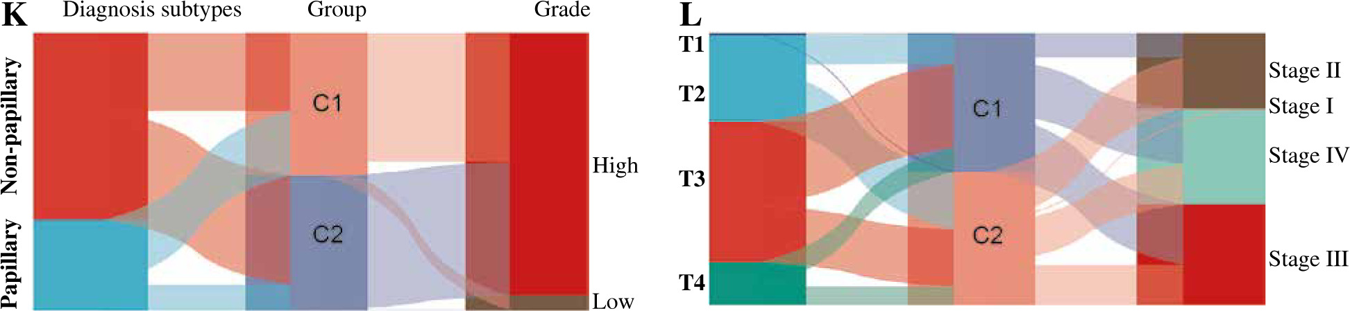 We analyzed the difference in prognosis between the C1 and C2 groups, finding that overall survival (OS), disease-specific survival (DSS) and progression-free interval (PFI) were also associated with worse survival outcomes in Group C1 than in Group C2 (Fig. 3A-C). There was no significant difference in age between Group C1 and Group C2, but the percentage of non-papillary bladder cancer and percentage of bladder cancer with a high grade in Group C1 was higher than that in Group C2; furthermore, pathological TNM staging was more severe in Group C2 than in Group C1 (Fig. 3D-J, Table 1). The differences in pathological characteristics between Group 1 and Group C2 can be seen more directly in Figure 3K, L.