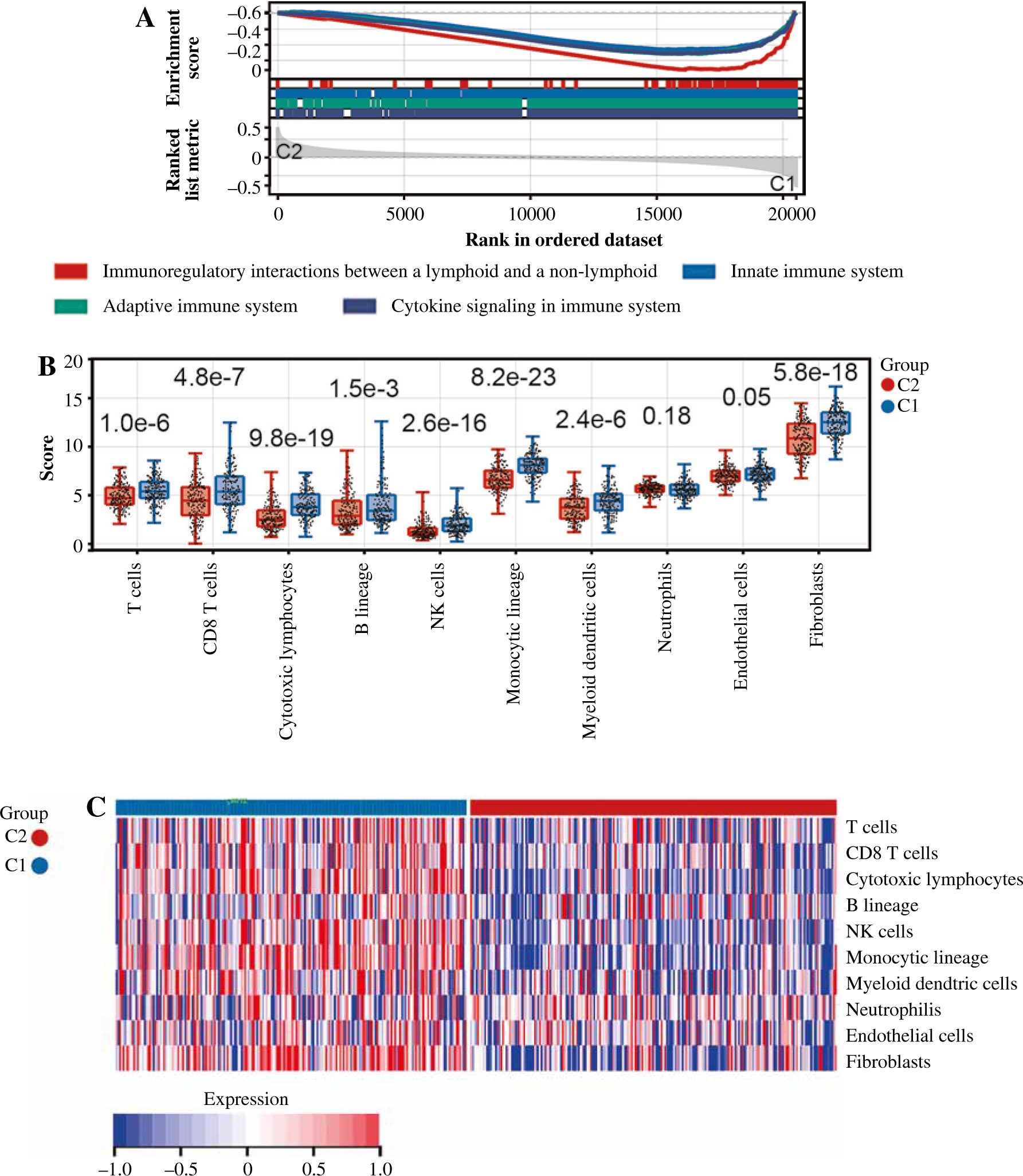 Next, we elucidated by GSEA a potential regulatory mechanism leading to a difference in prognosis between patients in group C1 and those in group C2. Adaptive immune system, innate immune system, lymphocyte and lymphocyte interactions, and cytokine signaling in the immune system are concentrated in group C1, and the expression was downregulated, whereas these signaling pathways were upregulated in Group C2 (Fig. 4A), so we suspected that the difference in prognosis between these two groups of patients may be related to immunity. In order to investigate the relationship between immune cell infiltration and C1 and C2 groups, we used the CIBERSORT method to evaluate the relative immune cell levels in the two groups of patients. Patients in Group C1 had significantly higher blood infiltration of T cells, CD8 T cells, cytotoxic lymphocytes, B lymphocytes, NK cells, monocyte lines, dendritic cells, and fibroblasts, and the infiltration of neutrophil and endothelial cells did not differ significantly from that of Group C2 (Fig. 4B, C). In addition to the individual immune cells, we also used ESTIMATE to create an immune correlation score, including the immune cell score, the stromal cell score, and the composite score; these scores were found to be higher in Group C1 than in Group C2 (Fig. 4D, E). To explore whether immunotherapy differed between Groups C1 and C2, we used tumor immunodeficiency and rejection analysis (TIDE) to assess whether patients in Group C1 had a higher TIDE score than those in Group C2; it suggested that patients in Group C1 had a stronger immune response than those in group C2 (Fig. 4F). Next, we predicted the immune response profile of patients in Groups C1 and C2 after the application of immunotherapy, and it was evident that the predicted response rate for immunotherapy was significantly lower in Group C1 than in Group C2 (Fig. 4G). All these observations indicate that the effect of immunotherapy in Group C1 may be worse than that in Group C2.