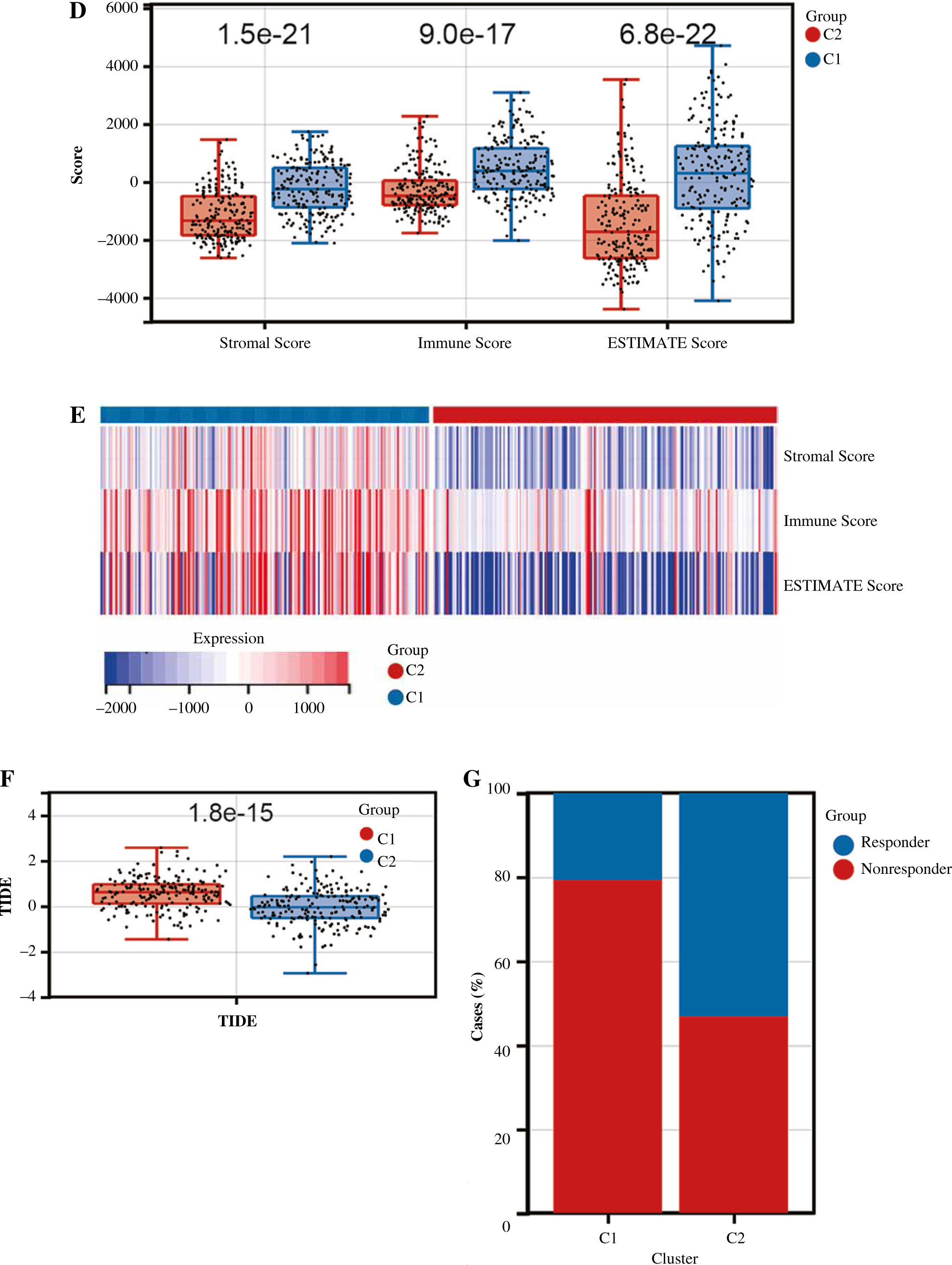 Cont. D, E) Boxplots and heatmap showed immune - related score differences between Cluster 1 and Cluster 2. F) Boxplots showed TIDE score differences between Cluster 1 and Cluster 2. G) Column chart showed the response of Cluster 1 and Cluster 2 to immunotherapy