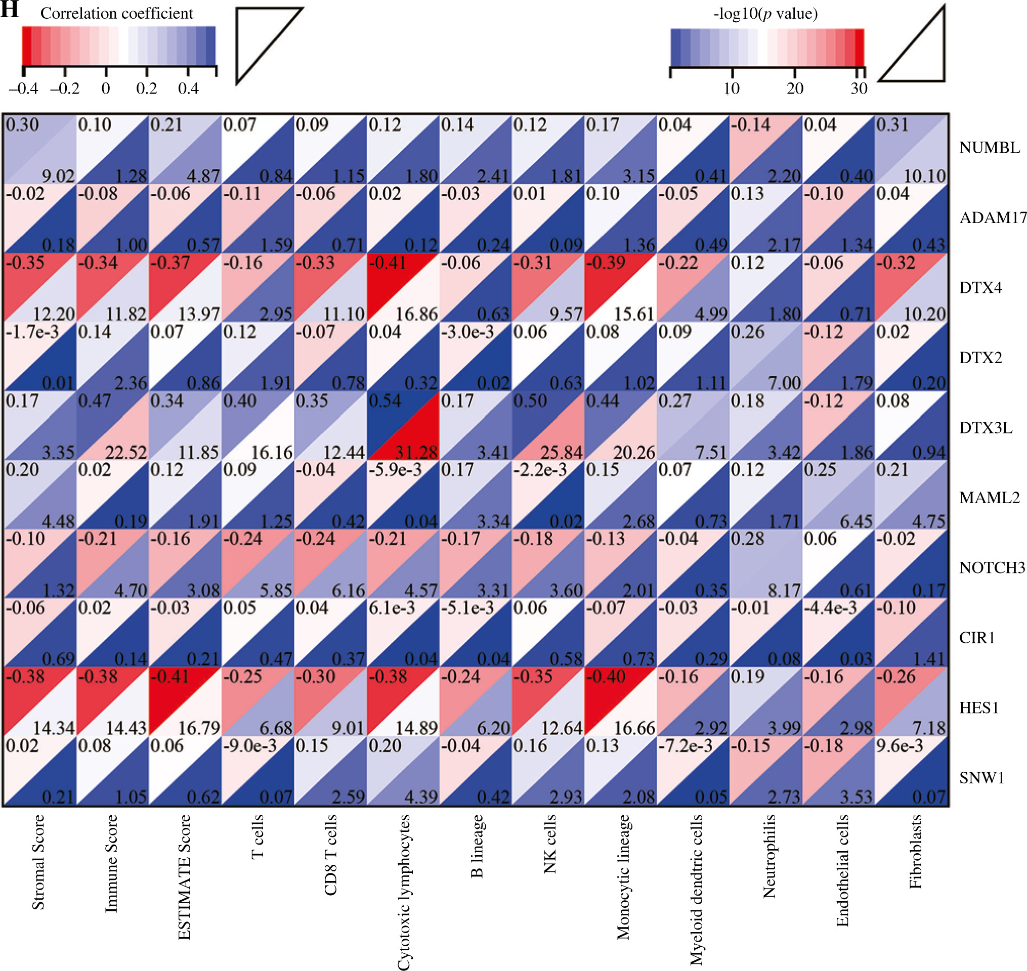 In addition, we analyzed associations between these 10 genes (SNW1, NOTCH3, ADAM17, MAML2, NUMBL, DTX2, DTX4, DTX3L, HES1, CIR1) and 10 immune cells and immune-related scores (Fig. 4H). The results showed that the NUMBL gene was positively correlated with the scores of fibroblasts and stromal cells, the DTX4 gene was negatively correlated with cytotoxic lymphocytes, NK cells, monocyte cell lines, fibroblasts, immune cell score, stromal cell score and general score, the DTX3L gene was positively correlated with T cells, CD8 T cells, cytotoxic lymphocytes, NK cells, monocyte lines, stromal cell score and the composite score, the NOTCH3 gene was negatively correlated with T cells, CD8 T cells, endo- thelial cells, and immune cell scores, while the HES1 gene was negatively correlated with almost all immune cells.