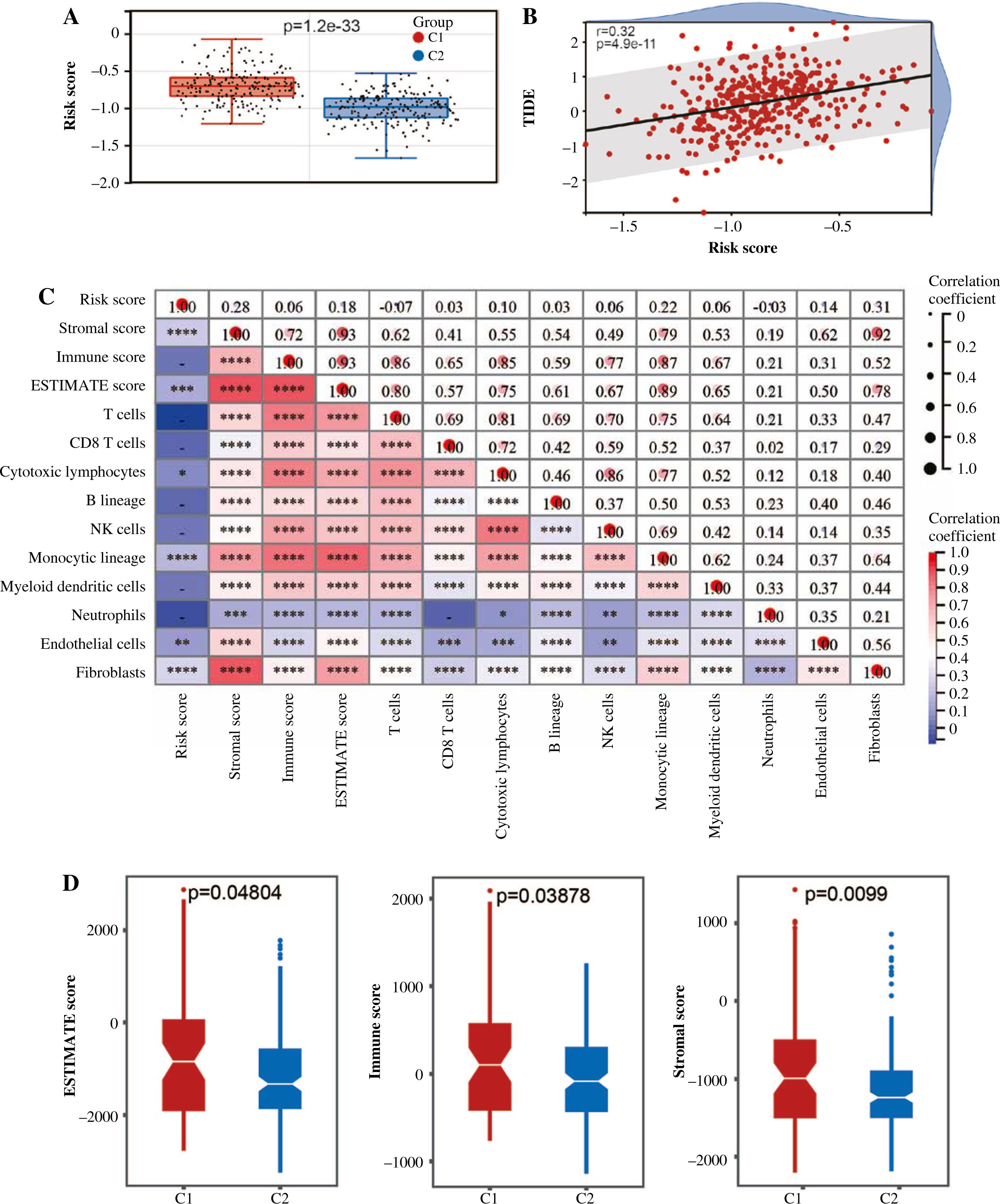 Based on the Lasso regression model, we calculated the risk score for each patient in the C1 and C2 groups. The risk score in the C1 group was significantly higher than that in the C2 group (Fig. 5A). Additionally, risk score was mainly correlated with stromal cell score, monocyte cell line and fibroblasts, while the correlation with other cells was weak (Fig. 5B). Next, we analyzed the correlation between TIDE score and risk score, and we found that there was also a positive correlation between TIDE score and risk score (Fig. 5C).
