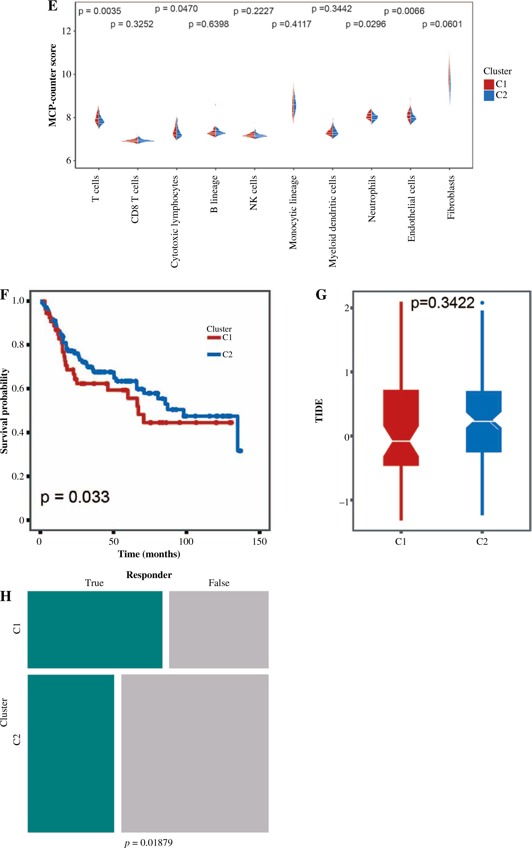 ESTIMATE analysis was applied to estimate the proportion of immune and stromal cells. MCP-Counter analysis was applied to further estimate immune and mesenchymal cell subsets. TIDE score and predicted response to immunotherapy were analyzed via the TIDE database (http://tide.dfci.harvard.edu/).