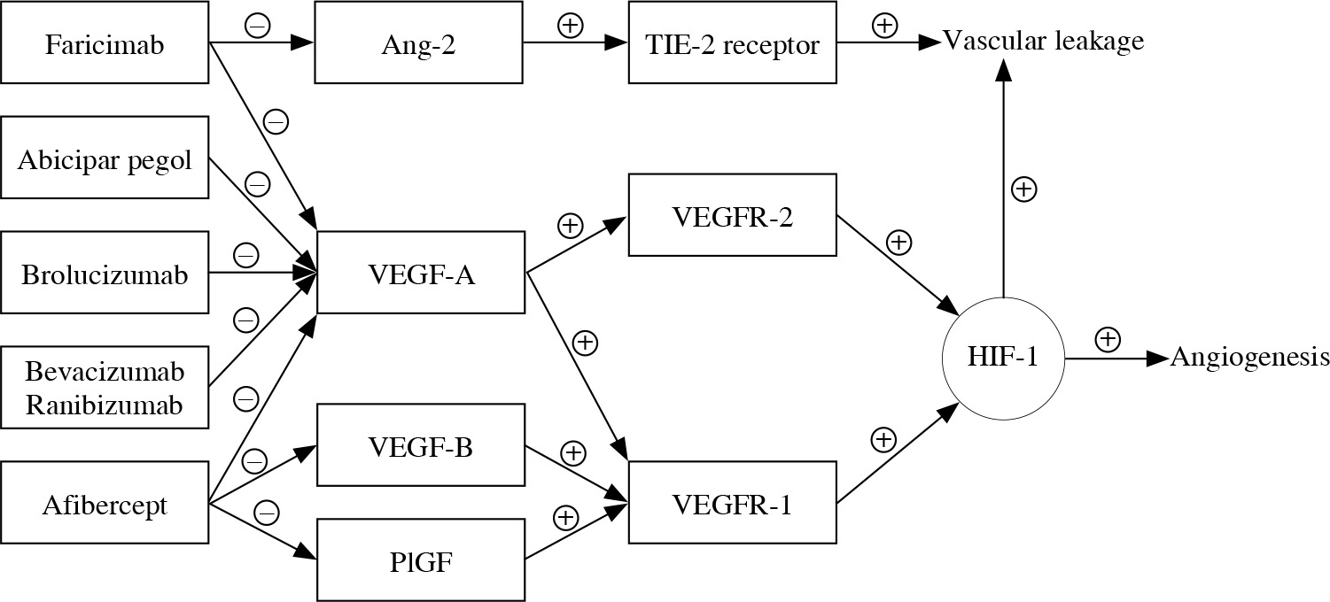 Angiogenesis is regulated in multiple mechanisms. VEGFs and their receptors (vascular endothelial growth factor receptors – VEGFRs), as well as placental growth factor (PlGF), angiopoietin 2 (Ang-2), platelet-derived growth factor-B (PDGF-B), vascular endothelial-protein tyrosine phosphatase (VE-PTP) and stromal-derived growth factor (SDF-1) promote angiogenesis secondary to elevation of hypoxia-inducible factor-1 (HIF-1) level upregulation. The subtypes of VEGFRs that are most important for AMD pathogenesis are VEGFR1 and VEGFR2. VEGFs’ main subtypes are VEGF-A and VEGF-B. VEGF-A binds with both VEGFR-1 and VEGFR-2, whereas VEGF-B (as well as PlGF) binds selectively with VEGFR-1 [7].