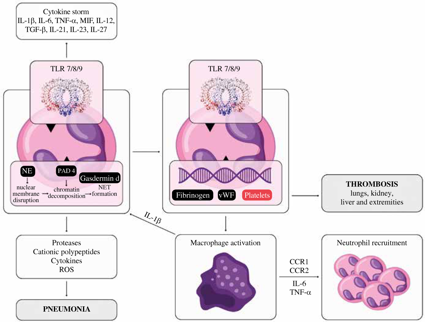 The role of neutrophils and platelets in the cytokine storm during COVID-19 infection. The activation of neutrophils induces selected cytokine production, which contributes to the cytokine storm and thus results in ARDS. Interaction of SARS-CoV-2 with TLR 7/8/9 results in the formation of neutrophil extracellular traps (NET), which are web-like chromatin structures produced by neutrophils. The interaction of fibrin and platelets with NET can cause thrombosis in several organs, especially the lungs