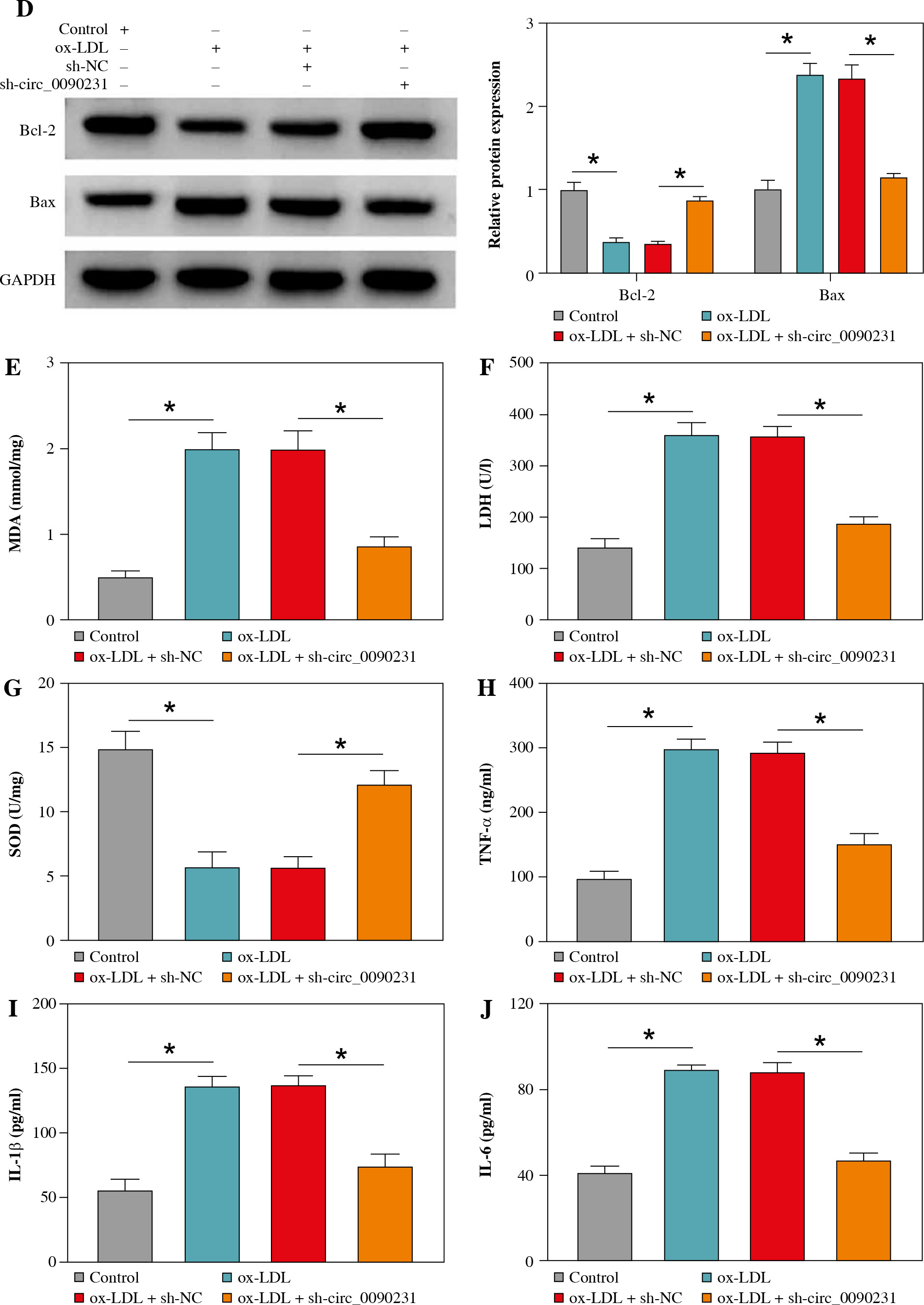 Knockdown of circ_0090231 inhibited ox-LDL-mediated angiogenesis, apoptosis, oxidative stress, and inflammatory response in HUVECs. HUVECs were treated with control, ox-LDL, ox-LDL + sh-NC, and ox-LDL + shcirc_ 0090231. A) RT-qPCR assay was used to determine circ_0090231 level in treated HUVECs. B) Tube formation assay was applied to assess the number of capillary-like structures of HUVECs. C) Flow cytometry assay was performed to measure the apoptosis rate in treated HUVECs. *p < 0.05 D) Western blot assay was conducted to test the protein levels of Bcl-2 and Bax in treated HUVECs. E-G) The activities of MDA, LDH, and SOD were detected by commercially available kits in treated HUVECs. H-J) ELISA kits were used to examine the secretions of TNF-α, IL-1β, and IL-6 in treated HUVECs. *p < 0.05