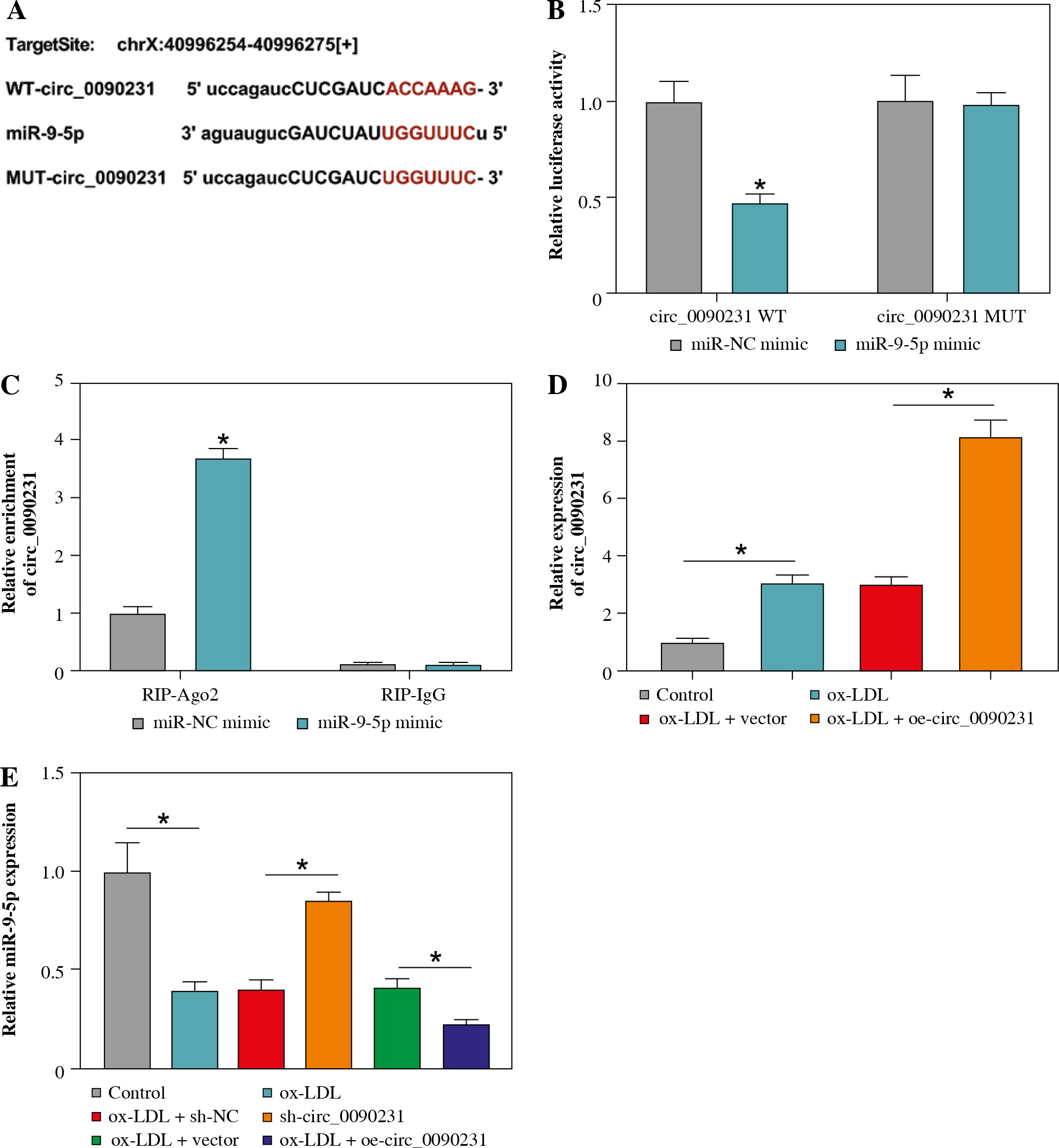 Circ_0090231 sequestered miR-9-5p in HUVECs. A) The biology website starBase predicted that there was a binding site between circ_0090231 and miR-9-5p. B) The binding was verified by dual-luciferase reporter assay. C) RIP assay was used to detect the enrichment of circ_0090231 in the RISC of HUVECs transfected with miR-NC mimic or miR-9-5p mimic using anti-Ago2 or IgG antibody. D) Circ_0090231 level was determined in HUVECs treated with control, ox-LDL, ox-LDL + vector, and ox-LDL + oe-circ_0090231 by RT-qPCR assay. E) miR-9-5p level was measured in HUVECs treated with control, ox-LDL, ox-LDL + sh-NC, ox-LDL + sh-circ_0090231, ox-LDL + vector, and ox-LDL + oecirc_ 0090231 by RT-qPCR assay. *p < 0.05