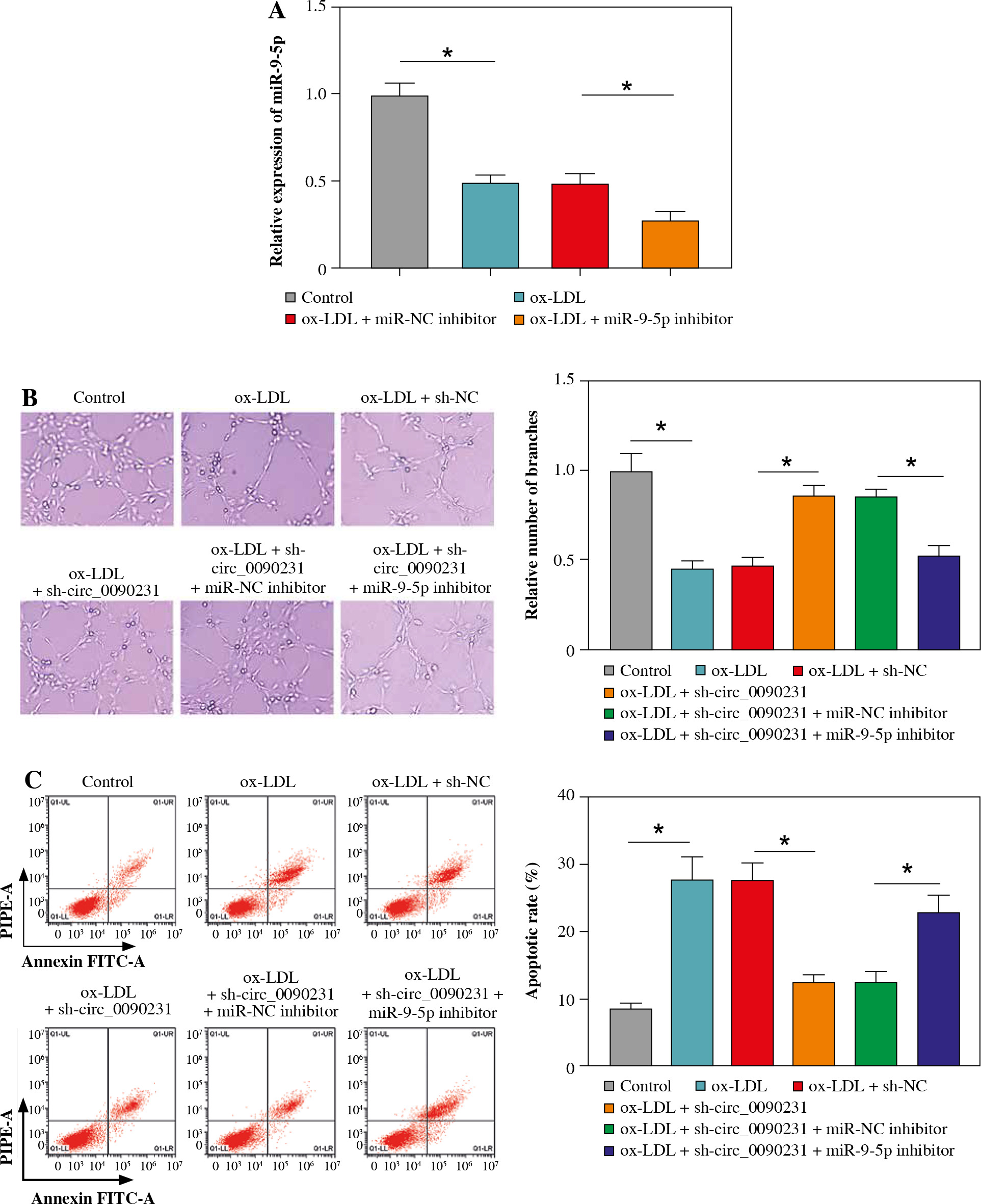 Considering the regulatory role of circ_0090231 in miR-9-5p expression in ox-LDL-treated HUVECs, we further explored whether the impact of circ_0090231 on ox-LDL- induced cell injury was associated with miR-9-5p. First of all, the transfection efficiency of miR-9-5p inhibitor in ox-LDL-triggered HUVECs was detected and presented in Figu- re 4A. Then, tube formation assay showed that circ_0090231 knockdown intensified the tube formation ability of HUVECs under the treatment of ox-LDL, which was significantly attenuated by miR-9-5p downregulation (Fig. 4B). Furthermore, the reduced expression of miR-9-5p could partly mitigate the suppressive action of sh-circ_0090231 on apoptosis in ox-LDL-treated HUVECs (Fig. 4C), as evidenced by decreased Bcl-2 and increased Bax (Fig. 4D). In addition, our results indicated that the negative effect of circ_0090231 downregulation on oxidative stress was effectively abrogated by the co-transfection of miR-9-5p inhibitor in ox-LDL-treated HUVECs, as described by improved MDA products and LDH activity, and reduced SOD activity (Fig. 4E-G). Consistently, ELISA assay demonstrated that the pro-inflammatory cytokines TNF-α, IL-1β, and IL-6 were reduced due to the silencing of circ_0090231, whereas miR-9-5p knockdown could distinctly relieve the effects in ox-LDL-induced HUVECs (Fig. 4H-J). All in all, these data implied that the downregulation of miR-9-5p could partly overturn the inhibitory effects of circ_0090231 deficiency on ox-LDL-caused HUVEC damage.