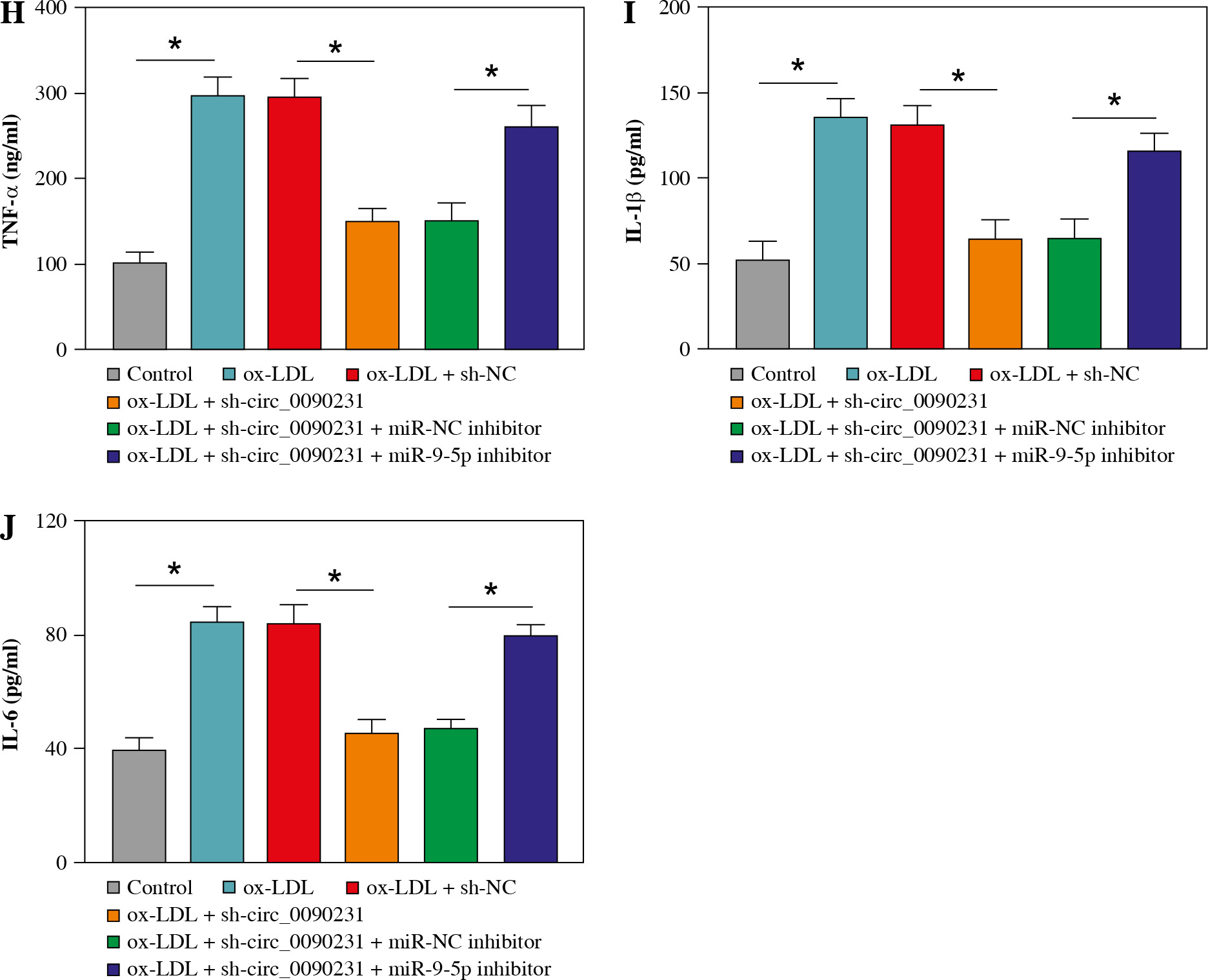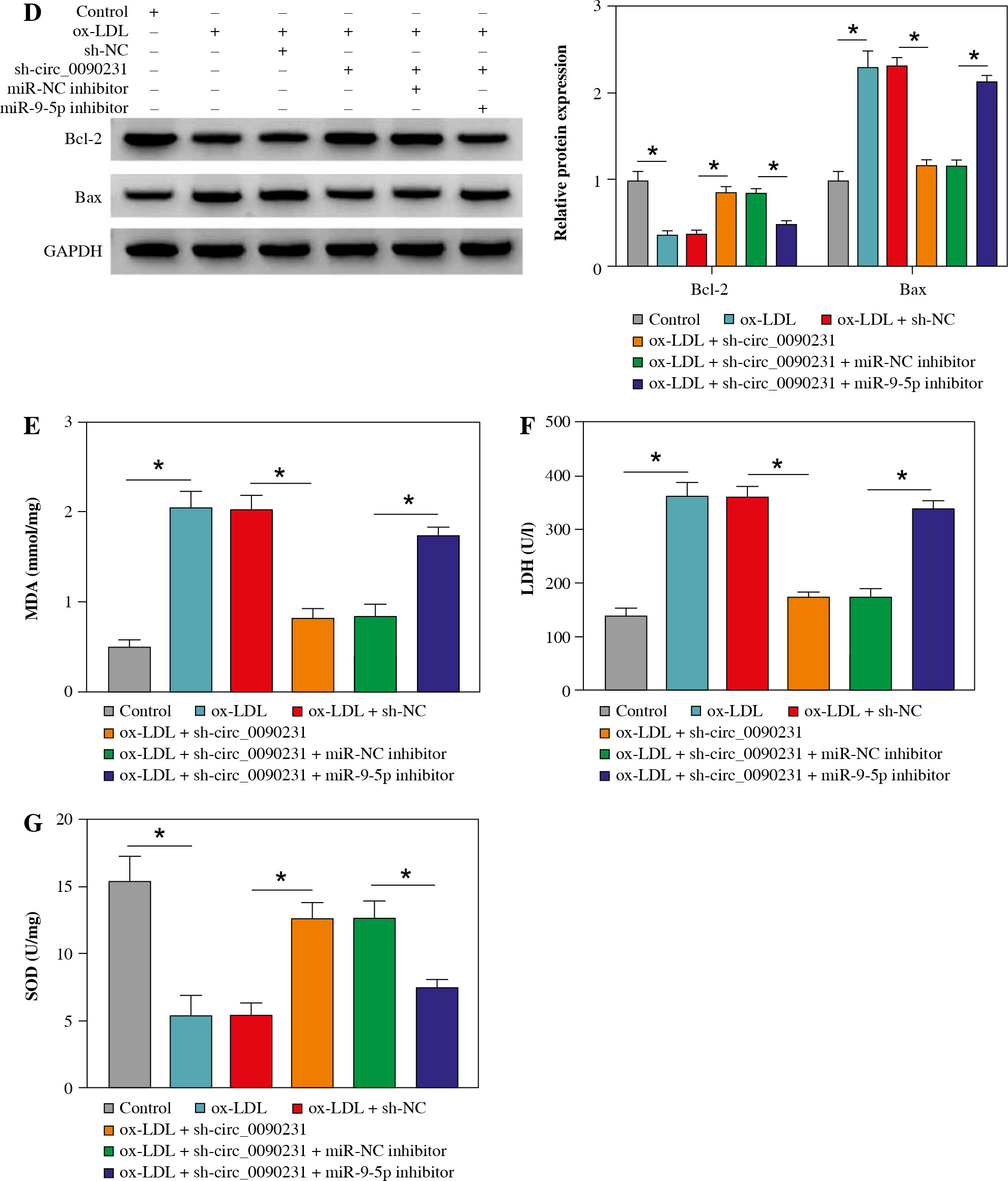 Downregulation of miR-9-5p abolished the effects of circ_0090231 silencing on angiogenesis, apoptosis, oxidative stress, and inflammatory response in ox-LDL-treated HUVECs. A) miR-9-5p level was determined by RT-qPCR assay in HUVECs treated with control, ox-LDL, ox-LDL + miR-NC inhibitor, and ox-LDL + miR-9-5p inhibitor. B-J) HUVECs were treated with control, ox-LDL, ox-LDL + sh-NC, ox-LDL + sh-circ_0090231, ox-LDL + sh-circ_0090231 + miR-NC inhibitor, and ox-LDL + sh-circ_0090231 + miR-9-5p inhibitor. B) Tube formation assay presented the formation of capillary-like structures. C) Apoptosis rate of HUVECs was assessed by flow cytometry assay. *p < 0.05 D) Protein levels of Bcl-2 and Bax in HUVECs were measured by western blot assay. E-G) Special assay kits identified of MDA, LDH, and SOD products in treated HUVECs. *p < 0.05 H-J) The secretions of TNF-α, IL-1β, and IL-6 in treated HUVECs were detected by ELISA kits. *p < 0.05