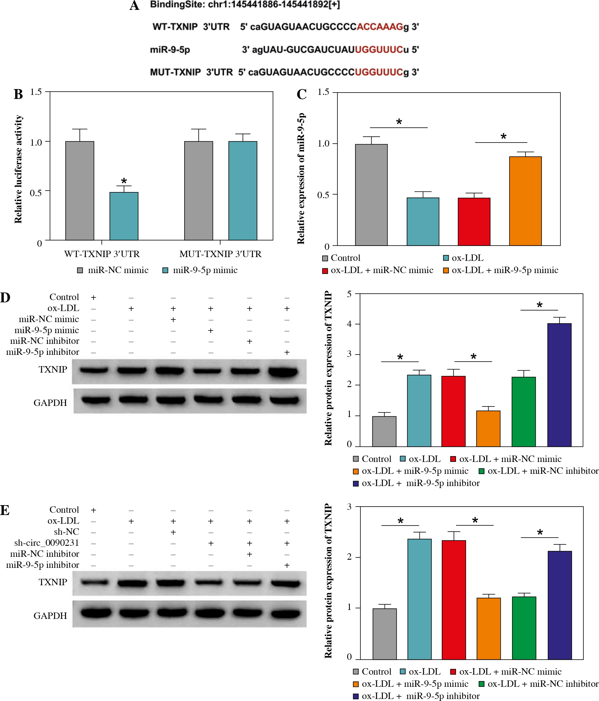 TXNIP was a target of miR-9-5p. A) The binding sequence between WT-TXNIP 3'UTR and miR-9-5p and the sequence of MUT-TXNIP 3'UTR. B) A dual-luciferase reporter assay was used to verify the binding. C) miR-9-5p level was determined by RT-qPCR assay in HUVECs treated with control, ox-LDL, ox-LDL + miR-NC mimic, and ox-LDL + miR-9-5p mimic. D) TXNIP protein level was measured by western blot assay in HUVECs treated with control, ox- LDL, ox-LDL + miR-NC mimic, ox-LDL + miR-9-5p mimic, ox-LDL + miR-NC inhibitor, and ox-LDL + miR-9-5p inhibitor. E) TXNIP protein level was assessed by western blot assay in HUVECs treated with control, ox-LDL, ox-LDL + sh-NC, ox-LDL + sh-circ_0090231, ox-LDL + sh-circ_0090231 + miR-NC inhibitor, and ox-LDL + sh-circ_0090231 + miR-9-5p inhibitor. *p < 0.05
