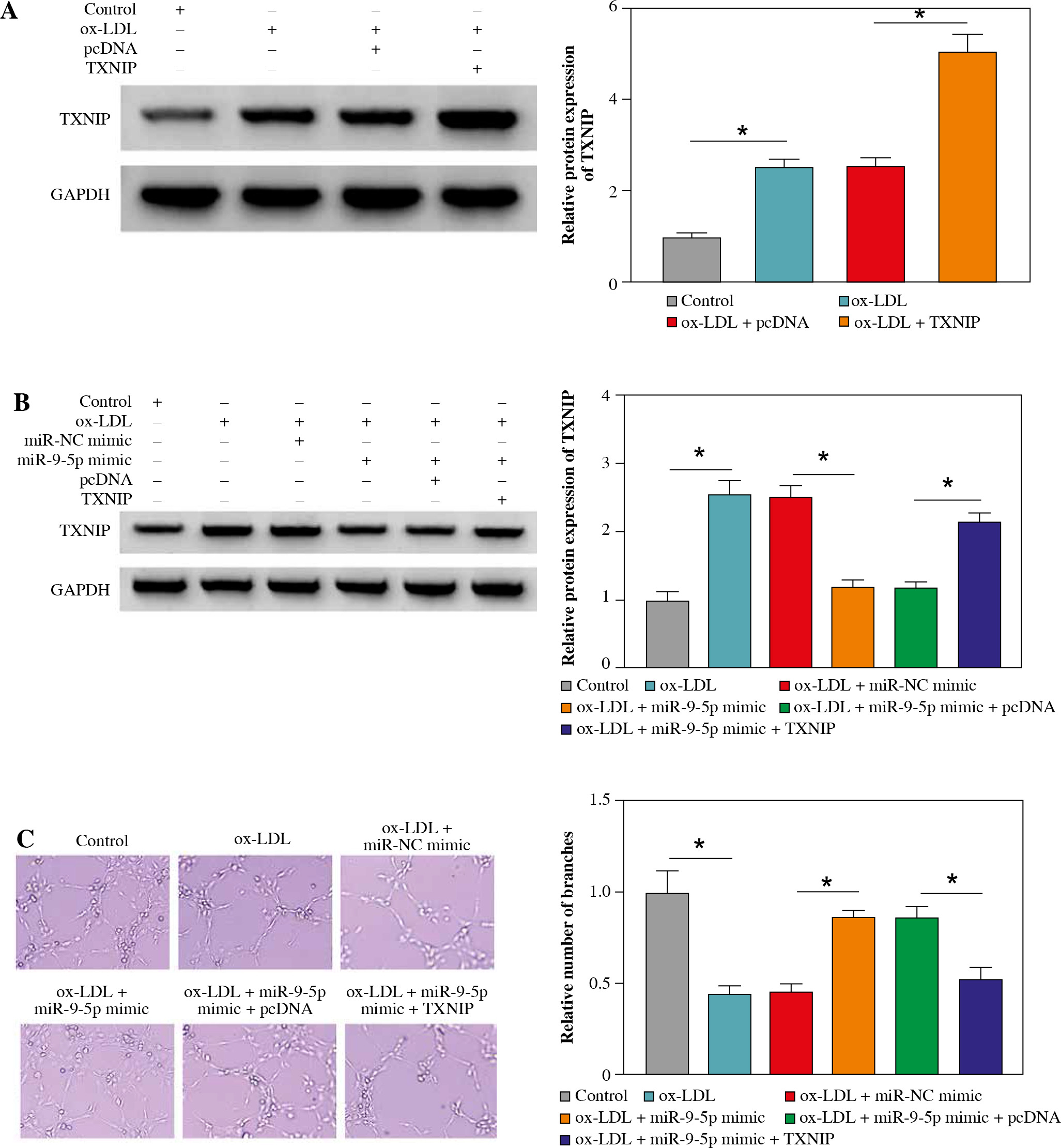 Overexpression of TXNIP partially overturned the repression of miR-9-5p on ox-LDL-caused HUVEC injury