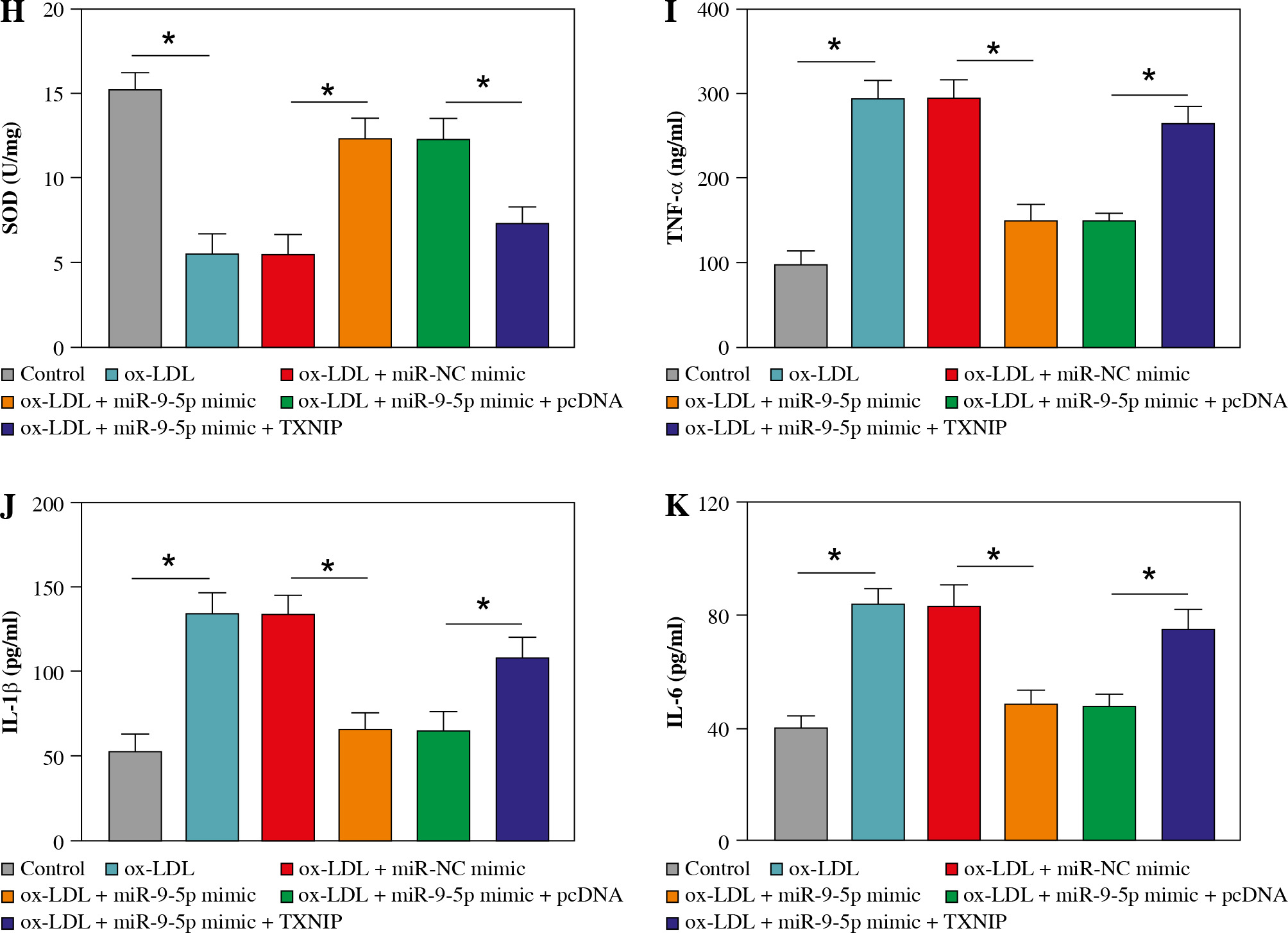 Upregulation of TXNIP partly overturned miR-9-5p-mediated angiogenesis, apoptosis, oxidative stress, and inflammatory response in ox-LDL-treated HUVECs. A) TXNIP protein level was examined by western blot assay in HUVECs treated with control, ox-LDL, ox-LDL + pcDNA, and ox-LDL + TXNIP. B-K) HUVECs were treated with control, ox-LDL, ox-LDL + miR-NC mimic, ox-LDL + miR-9-5p mimic, ox-LDL + miR-9-5p mimic + pcDNA, and ox-LDL + miR-9-5p mimic+TXNIP. B) TXNIP protein level was determined by western blot assay in treated HUVECs. C) Tube formation and apoptosis rate of HUVECs were detected by tube formation assay and flow cytometry assay. D) Tube formation and apoptosis rate of HUVECs were detected by tube formation assay and flow cytometry assay. E) Bcl-2 and Bax of HUVECs was measured by western blot assay. F, G) MDA, LDH products of treated HUVECs were analyzed by special assay kits. *p < 0.05 H) SOD products of treated HUVECs were analyzed by special assay kits. I-K) The secretions of TNF-α, IL-1β, and IL-6 of HUVECs were detected by ELISA kits. *p < 0.05