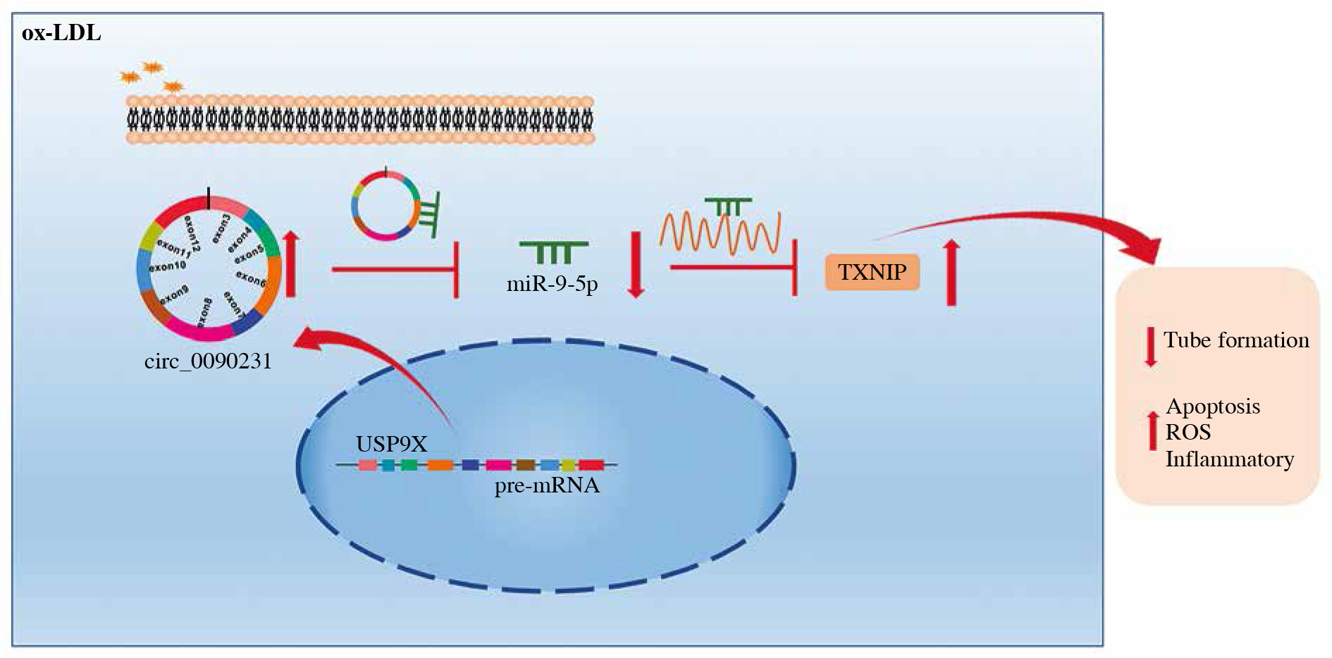 Taken together, these results demonstrated that circ_0090231 could regulate ox-LDL-triggered cell damage in HUVECs in part by targeting the miR-9-5p/TXNIP axis (Fig. 7), providing a crucial preclinical basis for AS treatment.