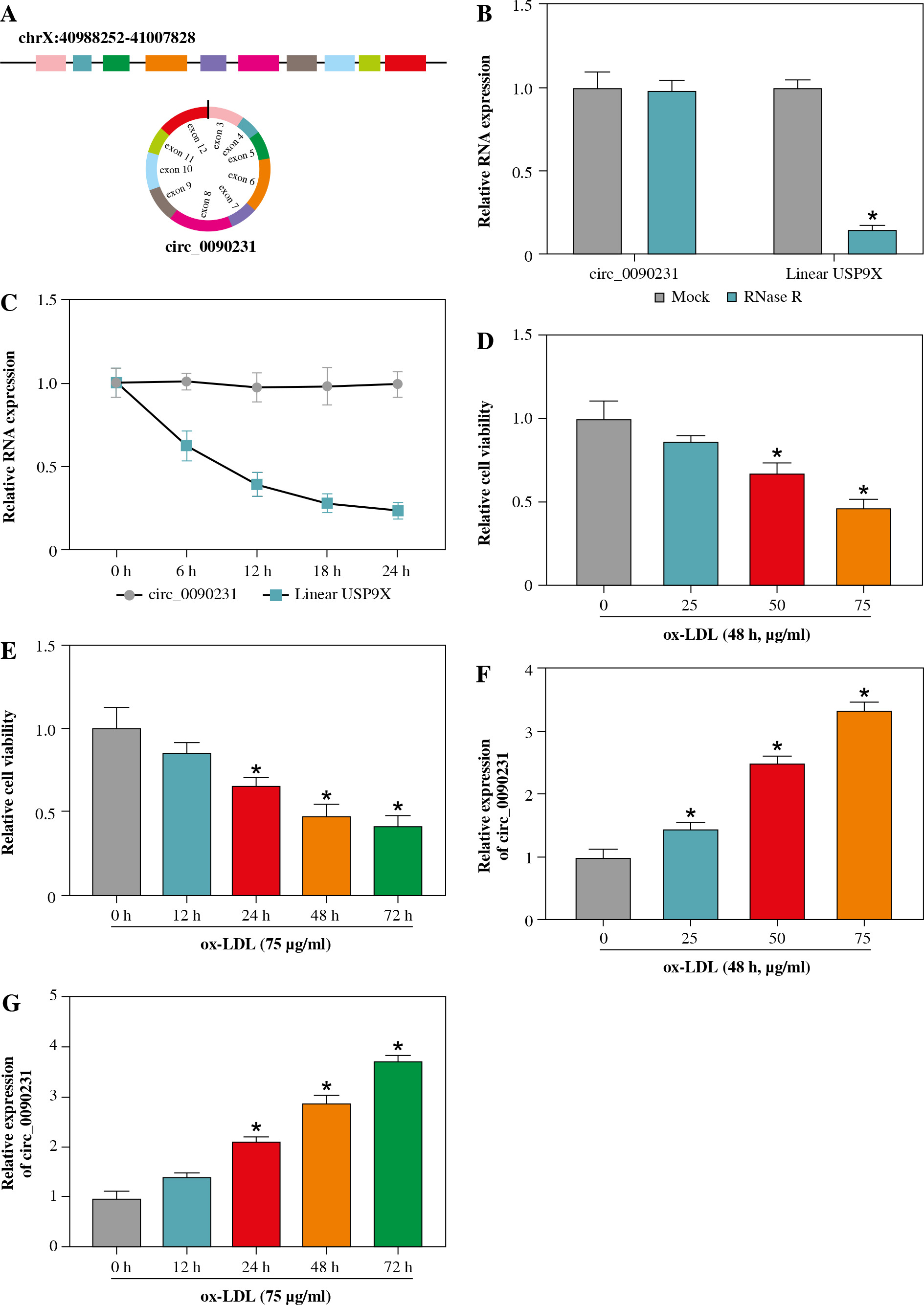 Circ_0090231 was elevated in ox-LDL-treated HUVECs. A) Schematic illustration showing uSP9X exons 3-12 circularization to form circ_0090231. B, C) Relative levels of circ_0090231 and uSP9X mRNA were detected by RT-qPCR assay in HUVECs treated with RNase R or actinomycin D. D, F) Cell viability and circ_0090231 expression were assessed by MTT assay and RT-qPCR assay in HUVECs treated with ox-LDL at different concentrations (0 μg/ml, 25 μg/ml, 50 μg/ml, and 75 μg/ml) for 48 h. E, G) MTT assay and RT-qPCR assay were used to detect cell viability and circ_0090231 expression in HUVECs stimulated with 75 μg/ml ox-LDL for 0, 12, 24, 48, and 72 h. *p < 0.05