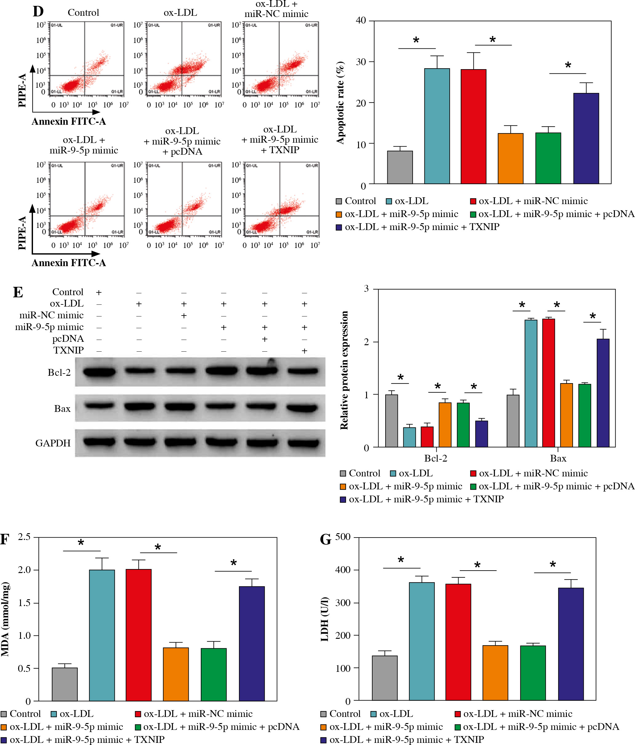 Upregulation of TXNIP partly overturned miR-9-5p-mediated angiogenesis, apoptosis, oxidative stress, and inflammatory response in ox-LDL-treated HUVECs. A) TXNIP protein level was examined by western blot assay in HUVECs treated with control, ox-LDL, ox-LDL + pcDNA, and ox-LDL + TXNIP. B-K) HUVECs were treated with control, ox-LDL, ox-LDL + miR-NC mimic, ox-LDL + miR-9-5p mimic, ox-LDL + miR-9-5p mimic + pcDNA, and ox-LDL + miR-9-5p mimic+TXNIP. B) TXNIP protein level was determined by western blot assay in treated HUVECs. C) Tube formation and apoptosis rate of HUVECs were detected by tube formation assay and flow cytometry assay. D) Tube formation and apoptosis rate of HUVECs were detected by tube formation assay and flow cytometry assay. E) Bcl-2 and Bax of HUVECs was measured by western blot assay. F, G) MDA, LDH products of treated HUVECs were analyzed by special assay kits. *p < 0.05 H) SOD products of treated HUVECs were analyzed by special assay kits. I-K) The secretions of TNF-α, IL-1β, and IL-6 of HUVECs were detected by ELISA kits. *p < 0.05