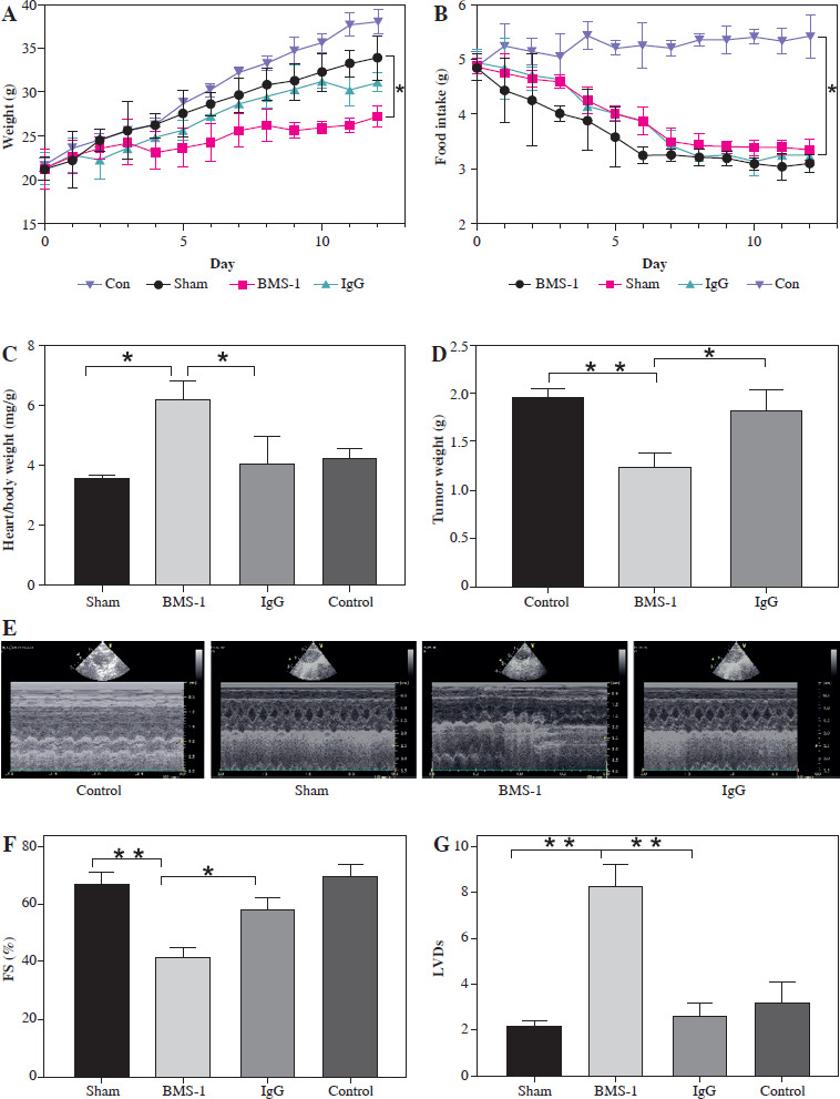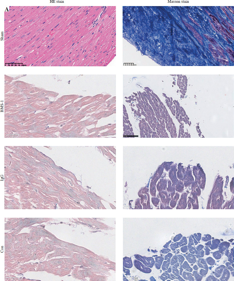 To further clarify the changes in cardiac function, we used cardiac ultrasound to assess cardiac function in mice before execution and found that both fraction systolic index and ejection fraction were significantly lower in BMS-1 compared to the control and IgG groups, but left ventricular end-diastolic diameter and left ventricular end-systolic diameter were both elevated (Fig. 1F-I).