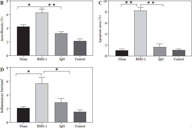 There was a significant increase in CK-MB, heart, and weight ratio after BMS-1 intervention relative to the control and IgG groups (Fig. 1).