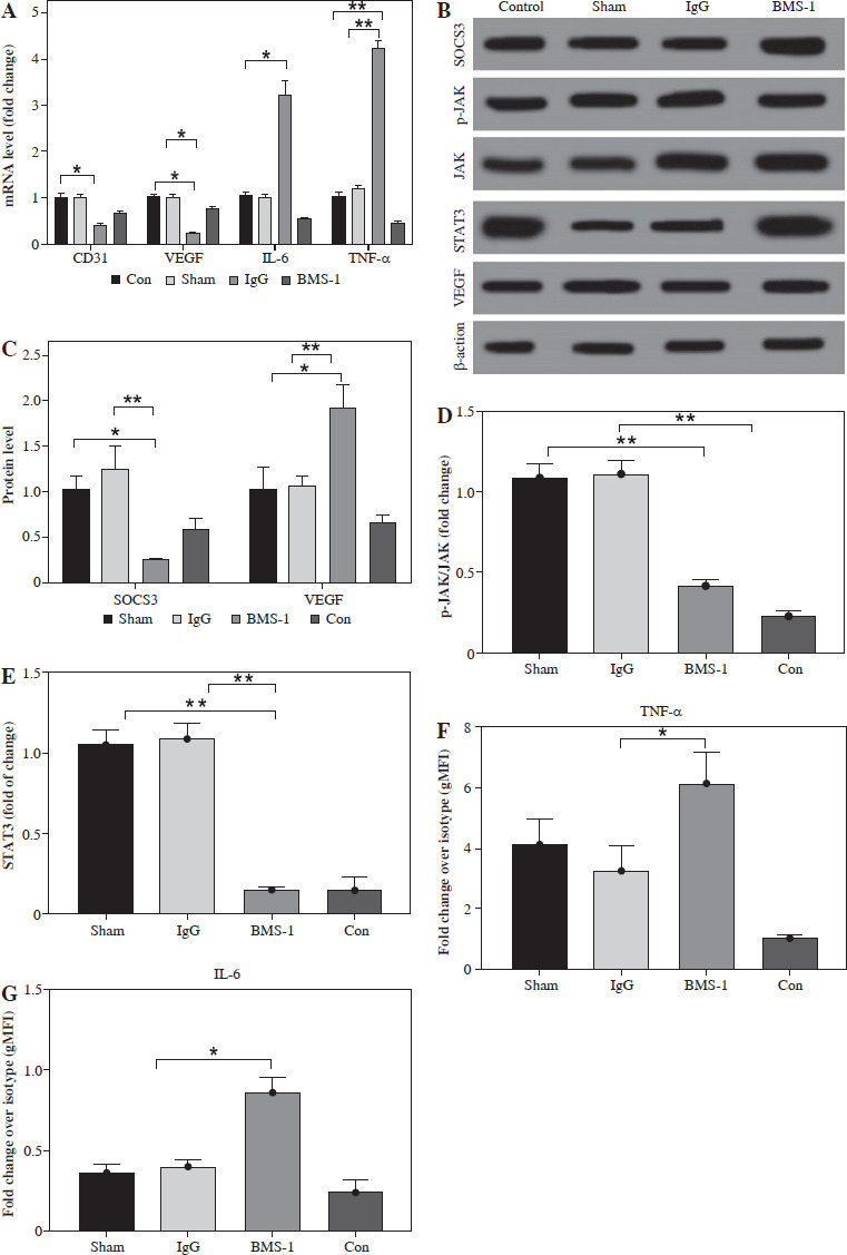 BMS-1 induced SOCS3/JAL/STAT3 signaling pathway and VEGF expression in RUES2 cells. A) mRNA level in heart tissue. B) Representative images of WB. C) SOCS3 and VEGF protein level. D) p-JAK/JAK protein level. E) STAT3 protein level. F) TNF-α level. G) IL-6 level. Values are presented as mean ± standard deviation. *p < 0.05, **p < 0.01. Each group of experiments was repeated three times