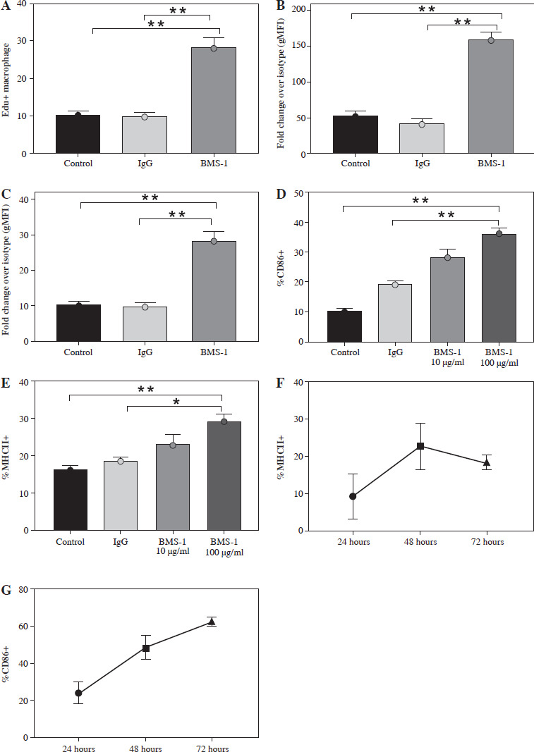BMS-1 treatment induced macrophage activation in tumor tissue. Macrophages were treated with medium only, IgG, or BMS-1 for 72 hours with different concentrations (BMS-1 10, 100 μg/ml). A) Proliferation was measured using EdU incorporation. B, C) They were stained to evaluate costimulatory molecule expression (CD86 and MHCII) by flow cytometry, and the geometric mean fluorescence intensity (gMFI) is shown as fold increase over an irrelevant isotype stain. D-G) BMS-1 was titrated (E) and macrophages were harvested at different time points following treatment with 100 mg/ml BMS-1. Values are presented as mean ± standard deviation. *p < 0.05, **p < 0.01. Each group of experiments was repeated three times