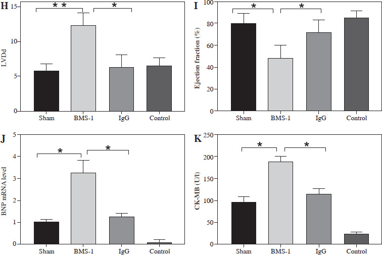To further clarify the changes in cardiac function, we used cardiac ultrasound to assess cardiac function in mice before execution and found that both fraction systolic index and ejection fraction were significantly lower in BMS-1 compared to the control and IgG groups, but left ventricular end-diastolic diameter and left ventricular end-systolic diameter were both elevated (Fig. 1F-I).