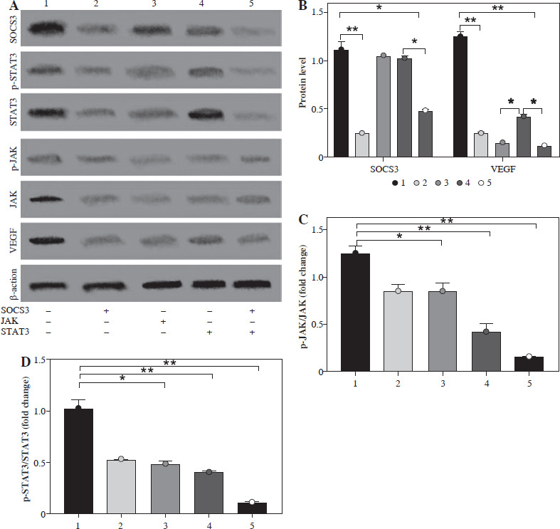 Effect of silencing SOCS3, JAK and STAT3 on SOC3/JAK/STAT3 signaling pathways in BMS-1 induces myocardial injury. A) Representative images in silencing SOCS3, JAK and STAT3 experiment. B) SOCS3 and VEGF protein level. C) p-JAK/JAK protein level. D) p-STAT3/STAT3 protein level. Values are presented as mean ± standard deviation. *p < 0.05, **p < 0.01. Each group of experiments was repeated three times
