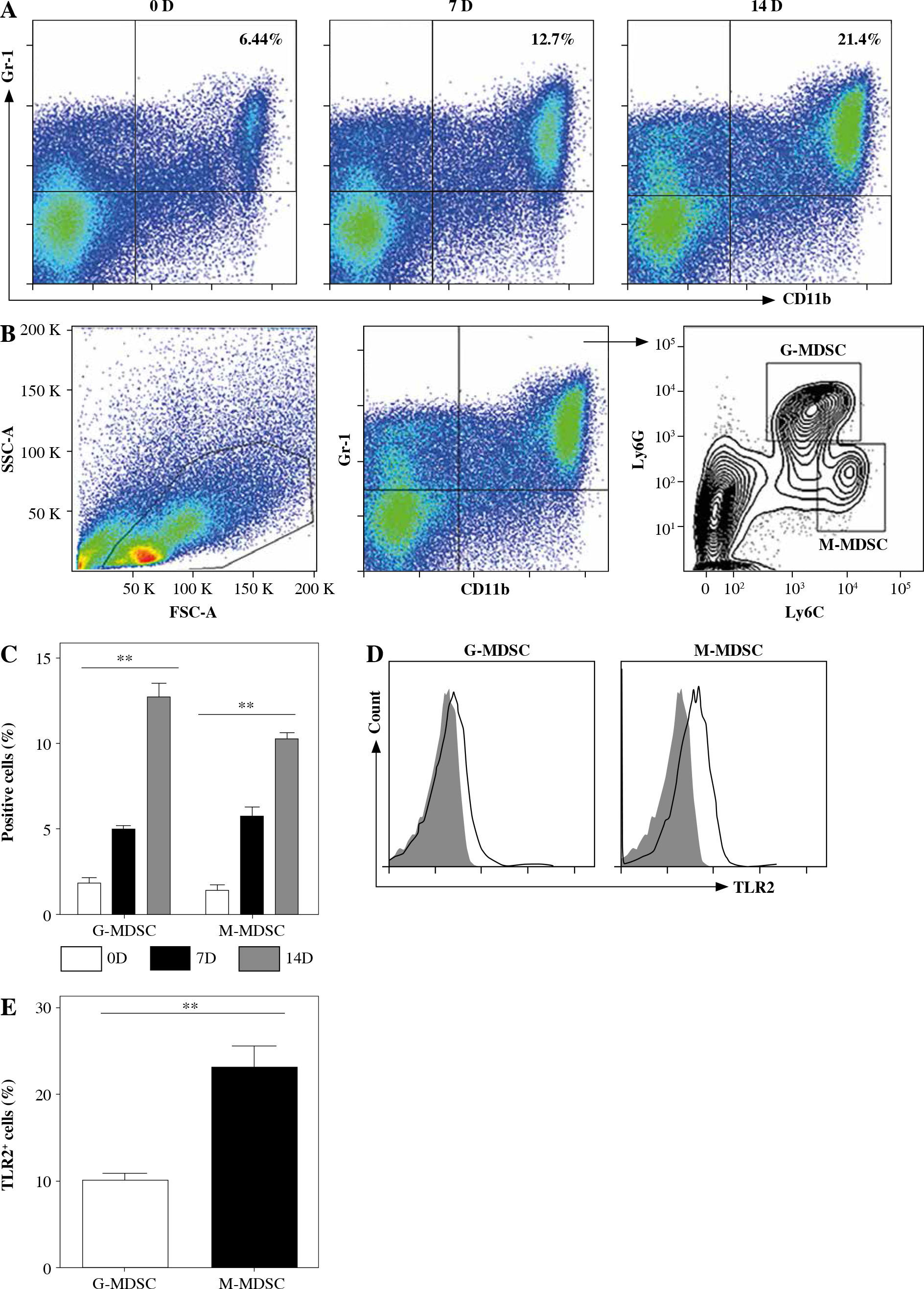 Chronic inflammation expanded M-MDSCs expressing TLR2. Mice were subcutaneously injected with heat-killed BCG bacteria (50 µg per animal/dose) at 1-week intervals three times. A) Percentages of CD11b+ Gr-1+ myeloid cells in spleen are presented at 0, 7 and 14 days after immunization. B) Flow cytometry analysis show the gating strategy of CD11b+ Gr-1+ Ly6Gneg Ly6Chigh monocytic MDSCs (M-MDSC) and CD11b+ Gr-1+ Ly6Ghigh Ly6Clow granulocytic MDSCs (G-MDSC) after immunization. C) Frequencies of M-MDSC and G-MDSC in spleen at 0, 7 and 14 days after immunization. D) Expression of TLR2 by M-MDSC and G-MDSC at 14 days after immunization. The open histogram represents staining with anti-TLR2 antibody and the shaded histogram represents staining with isotype control antibody. E) Data for percentages of TLR2 in M-MDSC and G-MDSC. Data were obtained from three independent experiments (n = 5 per group). **p < 0.01. Values in (A) were compared using two-way ANOVA with Bonferroni’s test, and values in (E) were compared using t-test