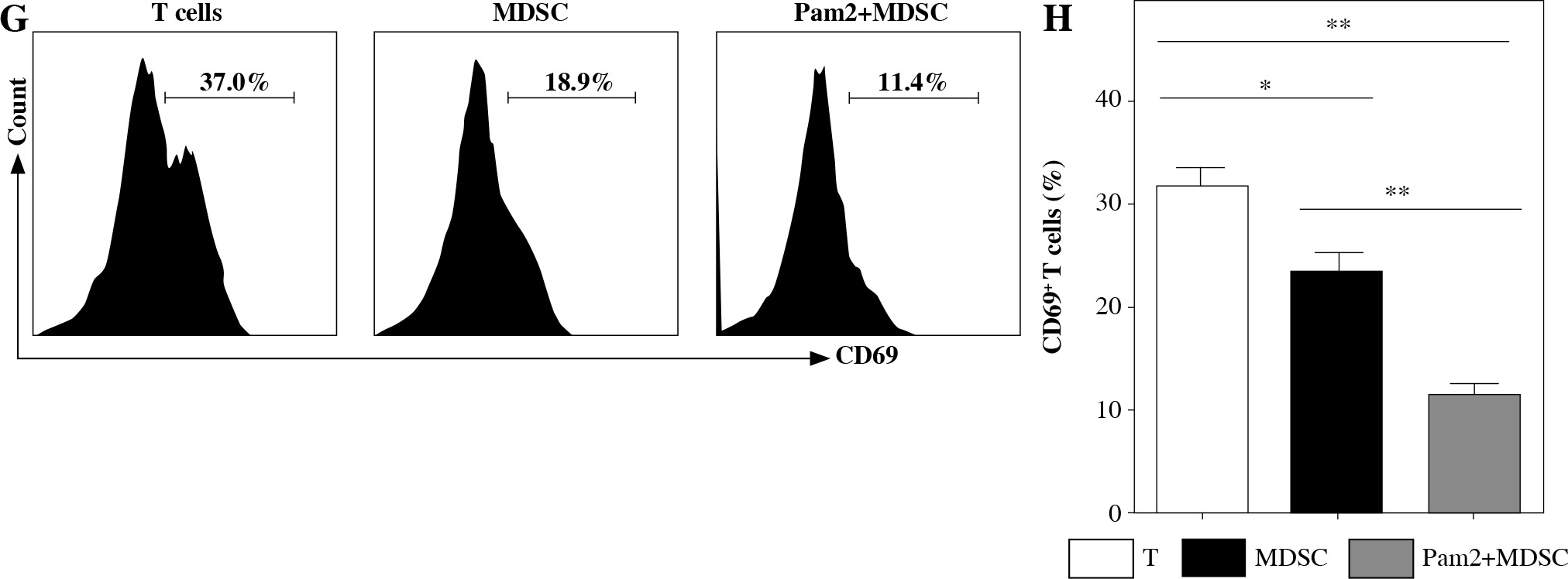 Pam2CSK4 enhanced immunosuppressive activity of M-MDSCs in vitro. CD11b+ Gr-1+ Ly6Gneg Ly6Chigh M-MDSCs (presented as MDSC) were isolated from spleen and enriched using FACS sorting. Purified normal CD4+ T cells were labeled with CFSE and co-incubated with M-MDSC at a ratio of 1 : 1 in the presence of Pam2CSK4 (1 µM) for 72 h. Proliferation, activation and IFN-g production of CFSE-labeled T cells was analyzed. A) Histograms gated on dividing CFSE-labeled CD4+ T. B) Numbers indicate the percentages of proliferation of CD4+ T. C) Representative dot plots show production of IFN-g gated on CFSE-labeled T cells. D) Numbers indicate the percentage of IFN-g+ T cells. E) Representative CD44 and CD69 histograms were gated on CFSE-labeled T cells. F) Numbers indicate the percentage of activated T cells. Data are representative of three independent experiments. *p < 0.05, **p < 0.01. Values in (B, D, F, and H) were compared using one-way ANOVA with Bonferroni’s test G) Representative CD44 and CD69 histograms are gated on CFSE-labeled T cells. H) Numbers indicate the percentage of activated T cells. Data are representative of three independent experiments. *p < 0.05, **p < 0.01. Values in (B, D, F, and H) were compared using one-way ANOVA with Bonferroni’s test