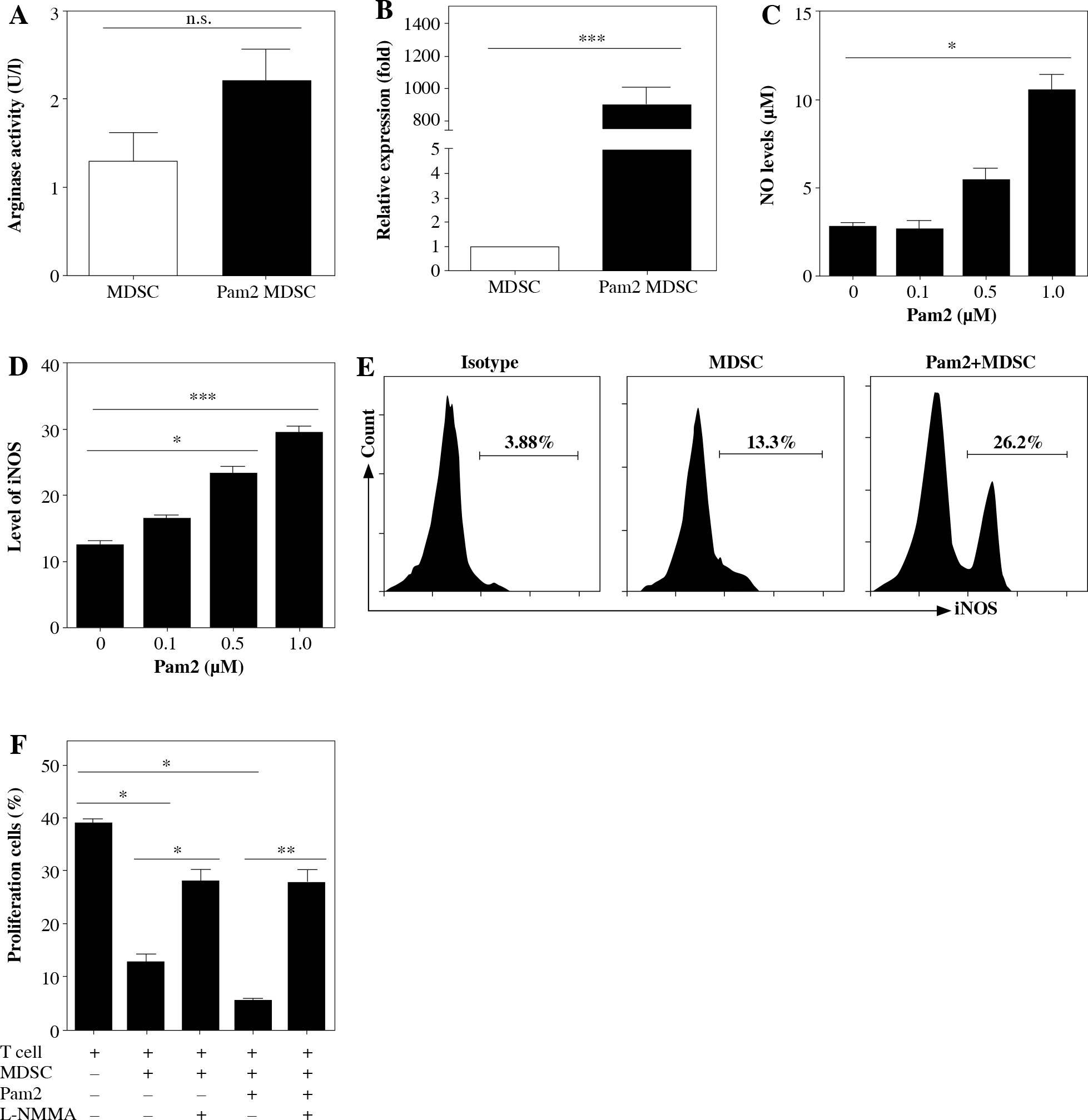 Next, we investigated the mechanism underlying the enhanced suppressive function of Pam2CSK4 treated M-MDSCs. Arginase and NO were critical molecules responsible for the suppressive activity of MDSCs. Thus, we examined the effects of Pam2CSK4 on the activities of arginase or iNOS in MDSCs. However, there was a non-significant trend towards an increase in ARG-1 activitity in Pam2CSK4 treated M-MDSCs (Fig. 3A). These data indicated that arginase activity was a minor contributor to stronger suppressive function of Pam2CSK4 treated M-MDSCs. Meanwhile, the expression level of NOS2 (Fig. 3B), the production of NO (Fig. 3C) and the activity of iNOS (Fig. 3D, E) of M-MDSCs were all significantly enhanced by Pam2CSK4. Moreover, the increase suppressive activity mediated by Pam2CSK4 was largely abrogated by the iNOS inhibitor L-NMMA (Fig. 3F). These data suggested that iNOS/NO is critical for the enhanced suppressive function of M-MDSCs with Pam2CSK4.