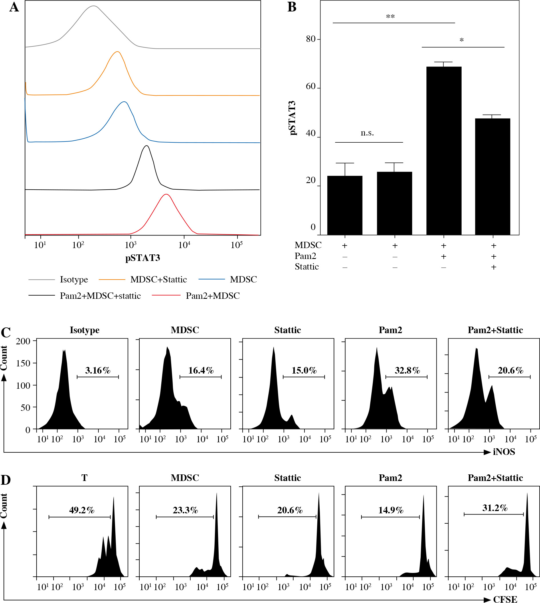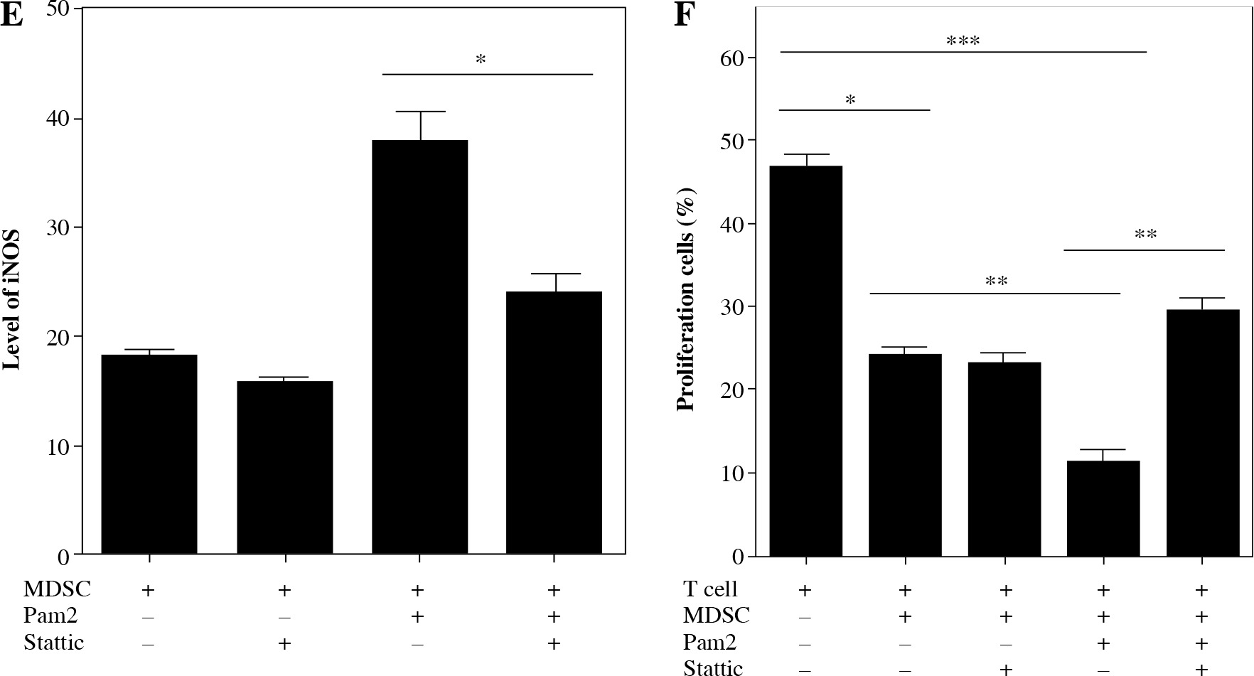 Given the functional significance of the STAT3 signal in MDSCs, we analyzed intracellular phosphorylated STAT3 in M-MDSCs with or without Pam2CSK4 treatment in the presence or absence of Stattic, a specific small molecule inhibitor of pSTAT3. Interestingly, Pam2CSK4 treated M-MDSCs had significantly higher expression levels of pSTAT3 compared with counterparts without Pam2CSK4 (Fig. 4A, B). The results showed that Stattic was capable of inhibiting pSTAT3 in Pam2CSK4 treated M-MDSCs but had no impact on M-MDSCs without Pam2CSK4. Stattic decreased the activity of iNOS in Pam2CSK4 treated M-MDSCs (Fig. 4C, E), and partly restored T cell proliferation (Fig. 4D, F). These results suggested that STAT3 activation was required for the higher iNOS activity, and contributed to stronger suppressive function of Pam2CSK4 treated M-MDSCs.