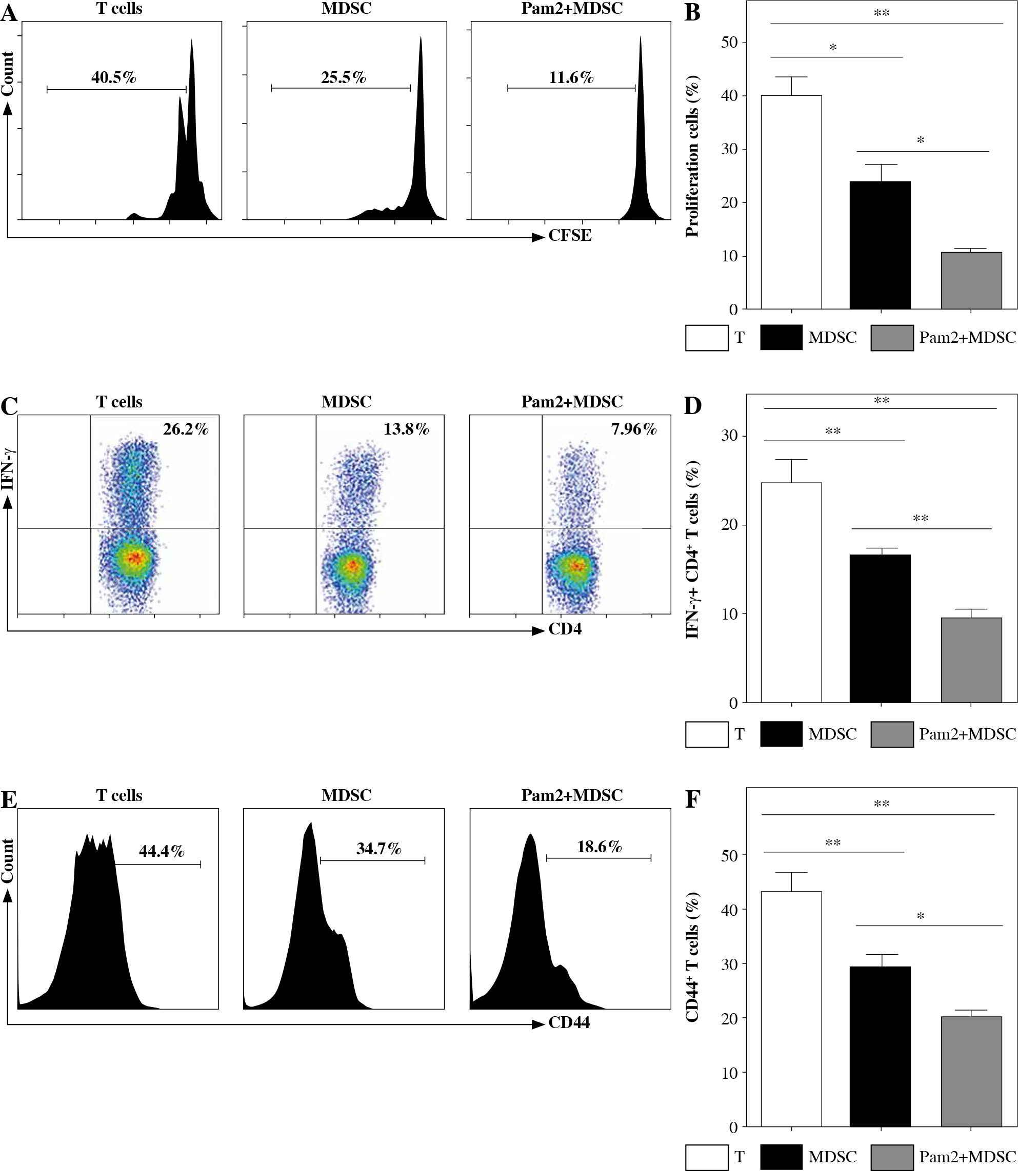To further explore the role of TLR2 in M-MDSCs, we investigated the effect of Pam2CSK4 on the immunosuppressive activity of M-MDSCs. CD11b+ Gr-1+ Ly6Gneg Ly6Chigh monocyte-like MDSCs (M-MDSCs) were enriched using FACS sorting from inflamed mouse. T cells were harvested from spleen of healthy mice, stimulated with anti-CD3/CD28 antibodies, and co-cultured with M-MDSCs at the ratio of 1 : 1 for 3 days with or without Pam2CSK4. The proliferation of CD4+ T lymphocytes was assessed using CFSE dilution assay. T cells were then evaluated for activation markers CD69 and CD44 and cytokine interferon (IFN)-γ production by flow cytometry. The results showed that M-MDSCs efficiently suppressed T cell proliferation and treatment of M-MDSCs with Pam2CSK4 resulted in significantly fewer proliferating CD4+ T cells (Fig. 2A). In addition, Pam2CSK4 treated M-MDSCs more potently impeded IFN-g production in T cells (Fig. 2B). Moreover, M-MDSCs inhibited T cell activation to a lesser extent when compared with their Pam2CSK4 treated counterparts (Fig. 2C, D). Taken together, these data demonstrated that Pam2CSK4 augmented the suppressive activity of M-MDSCs through TLR2 signaling.