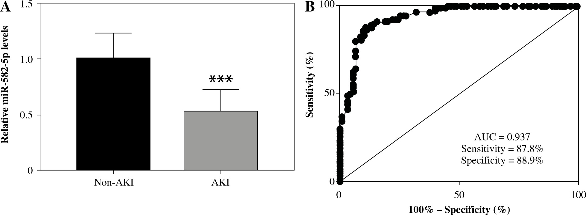 Expression of miR-582-5p in sepsis patients and its diagnostic performance. A) Relative expression of miR-582-5p in sepsis-induced acute kidney injury (AKI) patients (n = 90), compared to the non-AKI groups (n = 90). B) Evaluation of the diagnostic ability of miR-582-5p. Each sample was bio-replicated 3 times. A) Student’s t test. ***p < 0.001 compared to non-AKI group