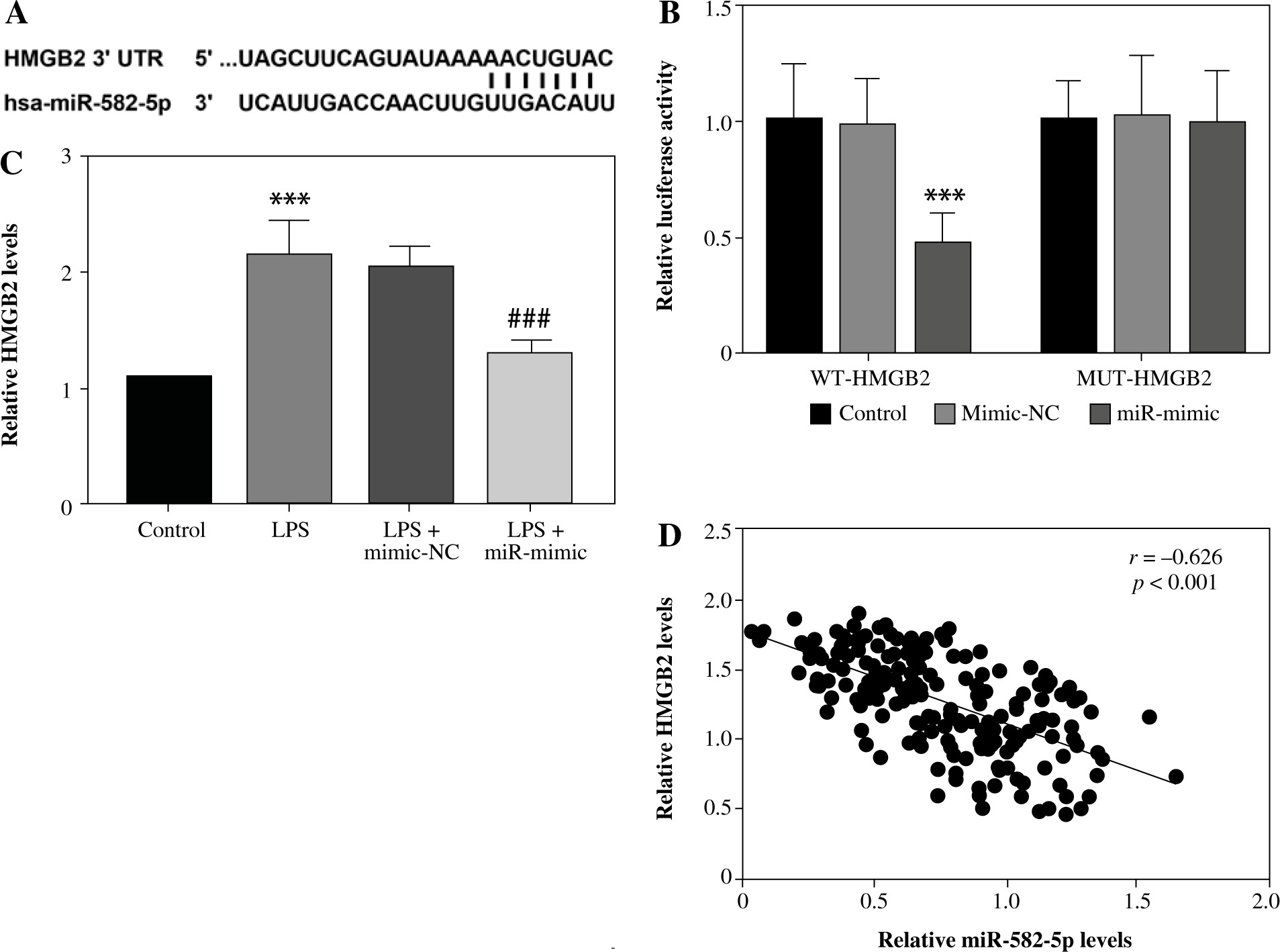MiR-582-5p regulated HMGB2 in a targeted manner. A) Complementary binding sites between miR-582-5p and HMGB2. B) Dual-luciferase reporter assay to analyze the interaction of miR-582-5p and HMGB2 in HK-2 cells. C) Expression level of HMGB2 measured by qRT-PCR. D) Correlation between miR-582-5p and HMGB2 by Pearson correlation analysis. Three repetitions were required for each experiment and each sample was bio-replicated 3 times. B, C) One-way analysis of variance. Student’s t test. ***p < 0.001 compared to control group, ###p < 0.001 compared to LPS + mimic-NC
