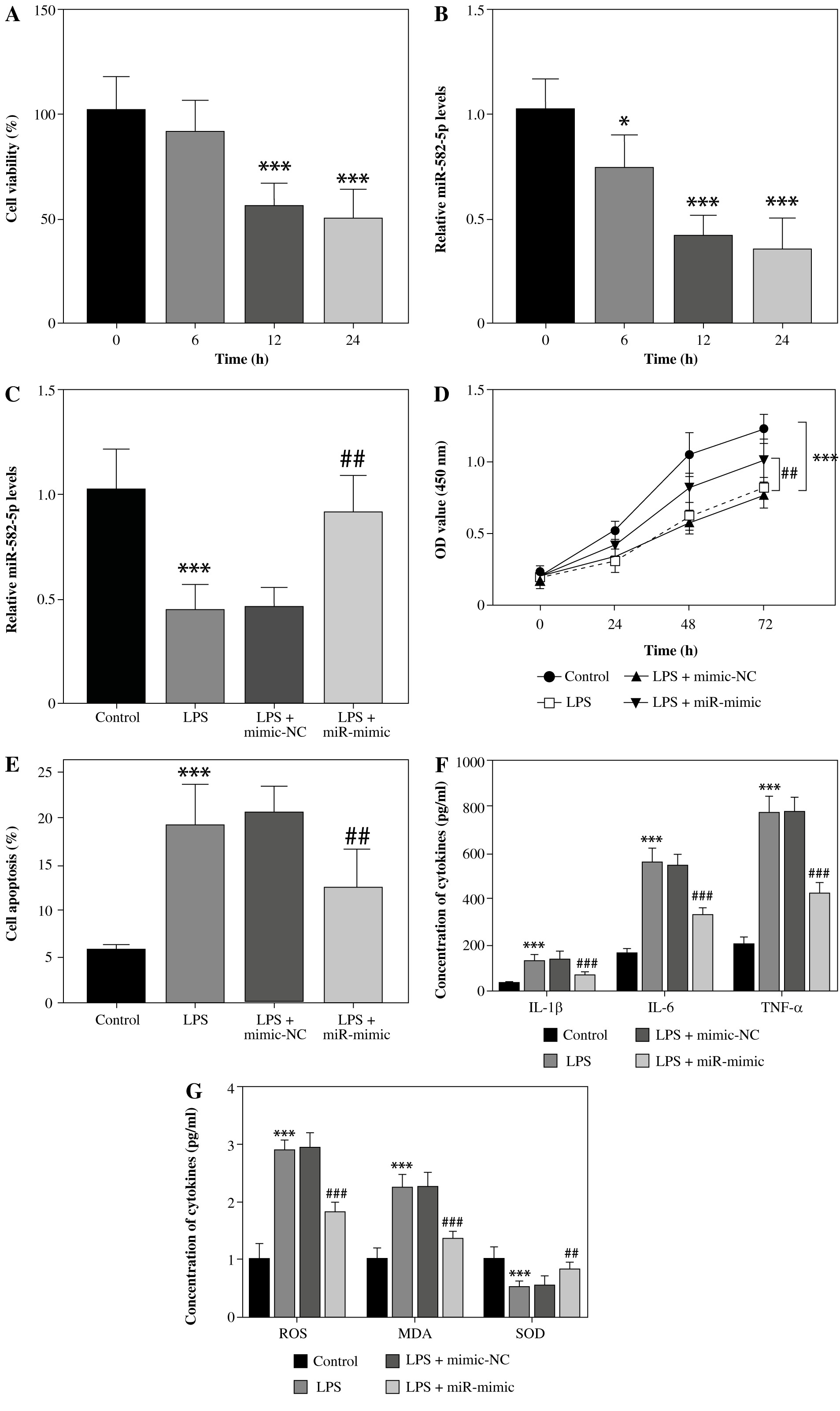 Function of miR-582-5p in LPS-induced HK2 cells. A) Cell viability decreased with time. B) Relative expression of miR-582-5p decreased with time, assessed by CCK-8 kit. C) Successful cell transfection verified by qRT-PCR of miR-582-5p. D) Poor cell viability was improved by increased miR-582-5p. E) The proportion of cell apoptosis decreased with increased miR-582-5p. F) Up-regulated miR-582-5p diminished the inflammatory response. Three repetitions were required for each experiment and each sample was bio-replicated 3 times. A-G) Student’s t test. *p < 0.05 compared to control; ***p < 0.001 vs. control group; ##p < 0.01 vs. LPS + mimic-NC; ###p < 0.001 vs. LPS + mimic-NC. G) Highly expressed miR-582-5p enhanced the ability to resist oxidative stress. Three repetitions were required for each experiment and each sample was bio-replicated 3 times. G) Student’s t test. *p < 0.05 compared to control; ***p < 0.001 vs. control group; ##p < 0.01 vs. LPS + mimic-NC; ###p < 0.001 vs. LPS + mimic-NC