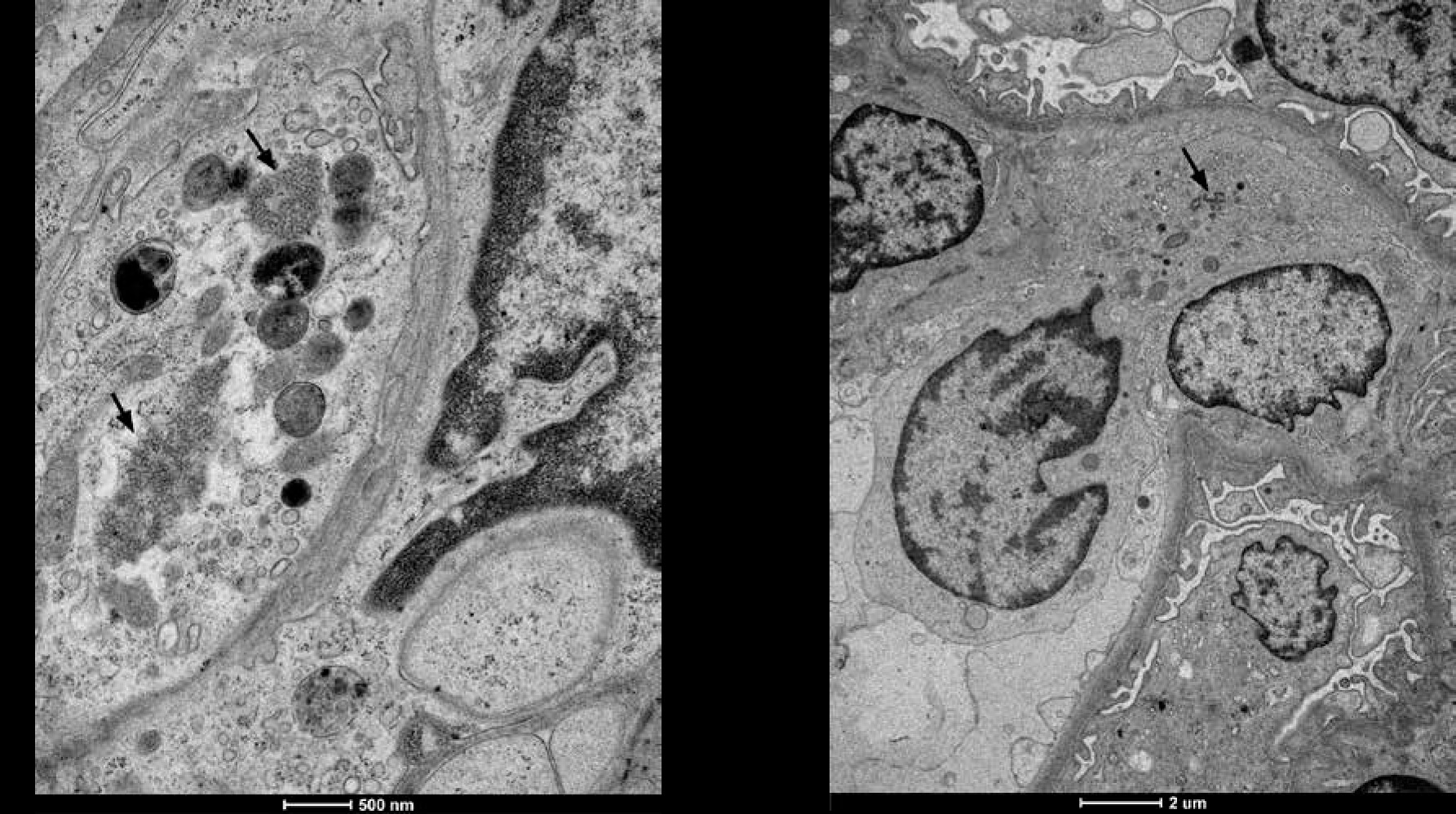 The images from representative regions were taken with a Morada CCD camera (Olympus Soft Imaging System Solutions GMBH, Münster, Germany) and the ultra- structure of the glomeruli was assessed. Obtained images were analyzed for the location, structure, and size of the deposits, changes in podocytes and the basement membrane, and the presence or absence of TRIs in the analyzed material. Other pathological changes at the ultrastructural level were also examined. The results of the assessment were compared with the clinical presentation, laboratory test results, and the ISN/RPS nephropathy classification.