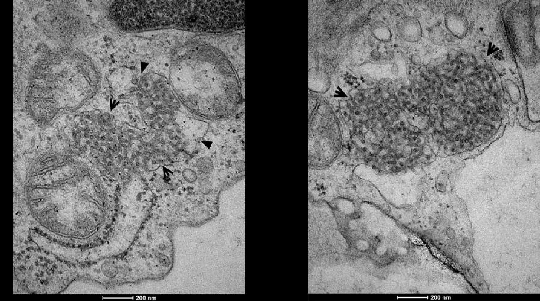 Tubuloreticular inclusions (TRIs) observed in monocytes (A) and macrophages (B) in renal biopsy samples collected from patients with juvenile systemic lupus erythematosus (jSLE). TRIs are indicated with arrows