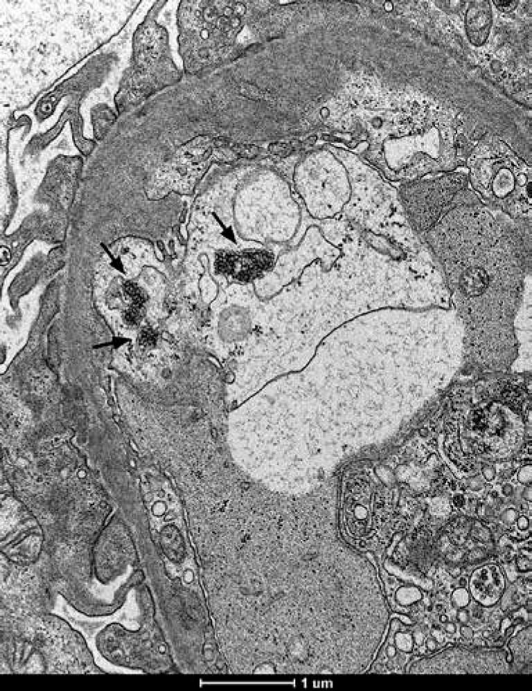 Fragment of a capillary with a highly swollen endothelial appendix containing three tubuloreticular inclusions (TRIs) (arrows) in renal biopsy samples collected from patients with juvenile systemic lupus erythematosus (jSLE)