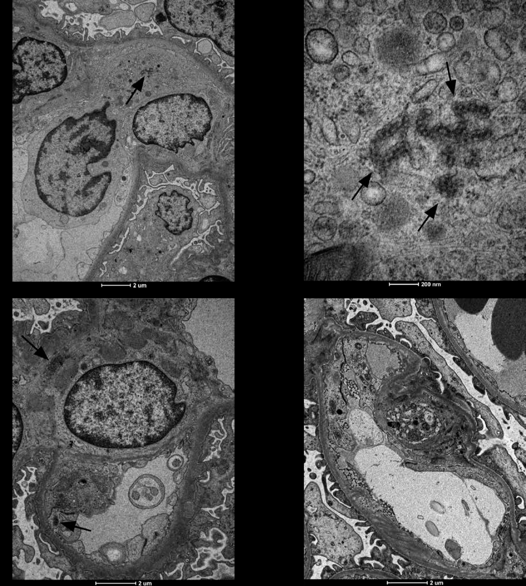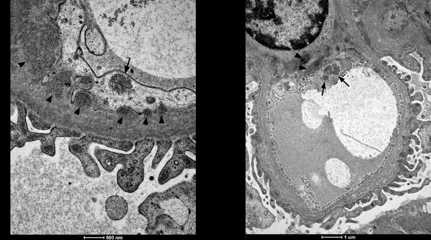 The biopsy evaluation should include light microscopy, immunofluorescence, and transmission electron microscopy (TEM) [10]. TEM examination is used to assess the basement membrane, the morphology of pod- ocytes, and the presence and location of deposits [12]. It also makes it possible to reveal the presence of specific intracellular structures such as tubuloreticular inclusions (TRIs) [13, 14].