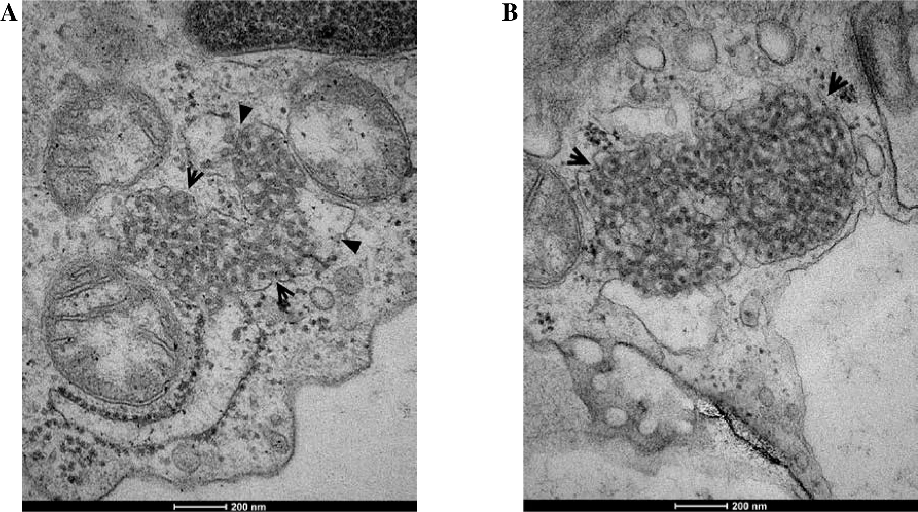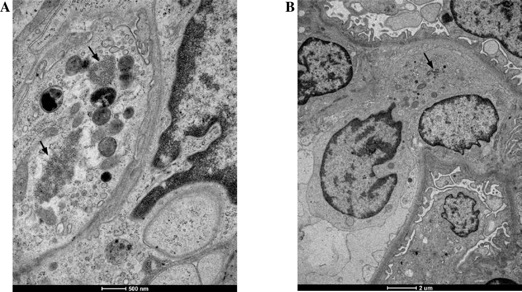 Tubuloreticular inclusions (TRIs) observed in monocytes (A) and macrophages (B) in renal biopsy samples collected from patients with juvenile systemic lupus erythematosus (jSLE). TRIs are indicated with arrows