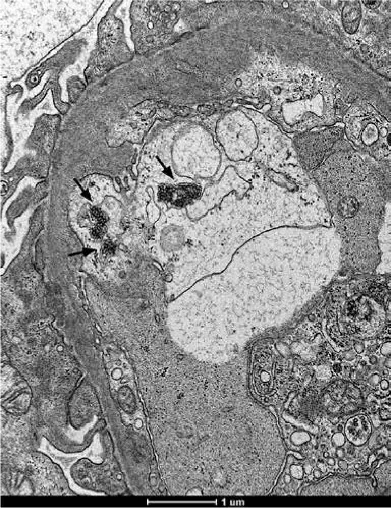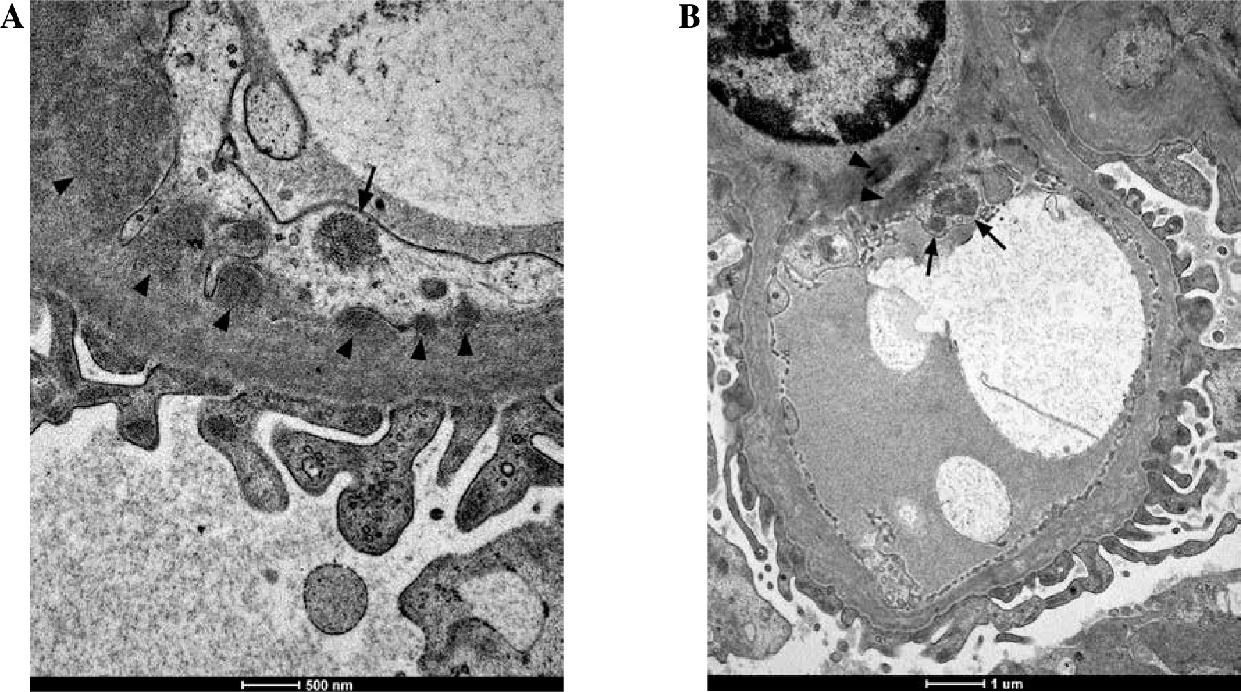 The images from representative regions were taken with a Morada CCD camera (Olympus Soft Imaging System Solutions GMBH, Münster, Germany) and the ultra- structure of the glomeruli was assessed. Obtained images were analyzed for the location, structure, and size of the deposits, changes in podocytes and the basement membrane, and the presence or absence of TRIs in the analyzed material. Other pathological changes at the ultrastructural level were also examined. The results of the assessment were compared with the clinical presentation, laboratory test results, and the ISN/RPS nephropathy classification.
