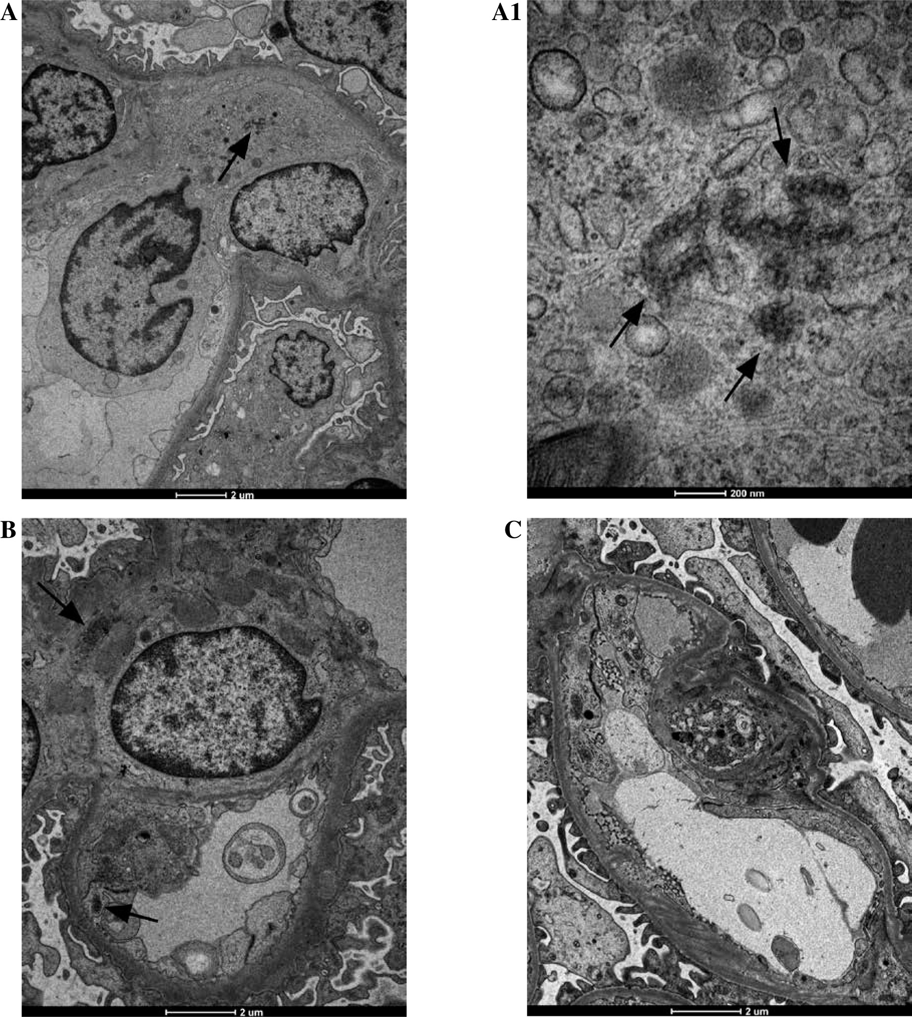 The figure shows two biopsies of Patient 6. The first biopsy was performed in 2012: A) TRI structures (arrows) are present in a monocyte, B) endothelial cells and within mesangial area; A1) Enlargement of the photo (A) revealing details of the ultrastructure of TRI structures. The second biopsy (C) performed 3 years after initiation of treatment revealed absence of TRIs
