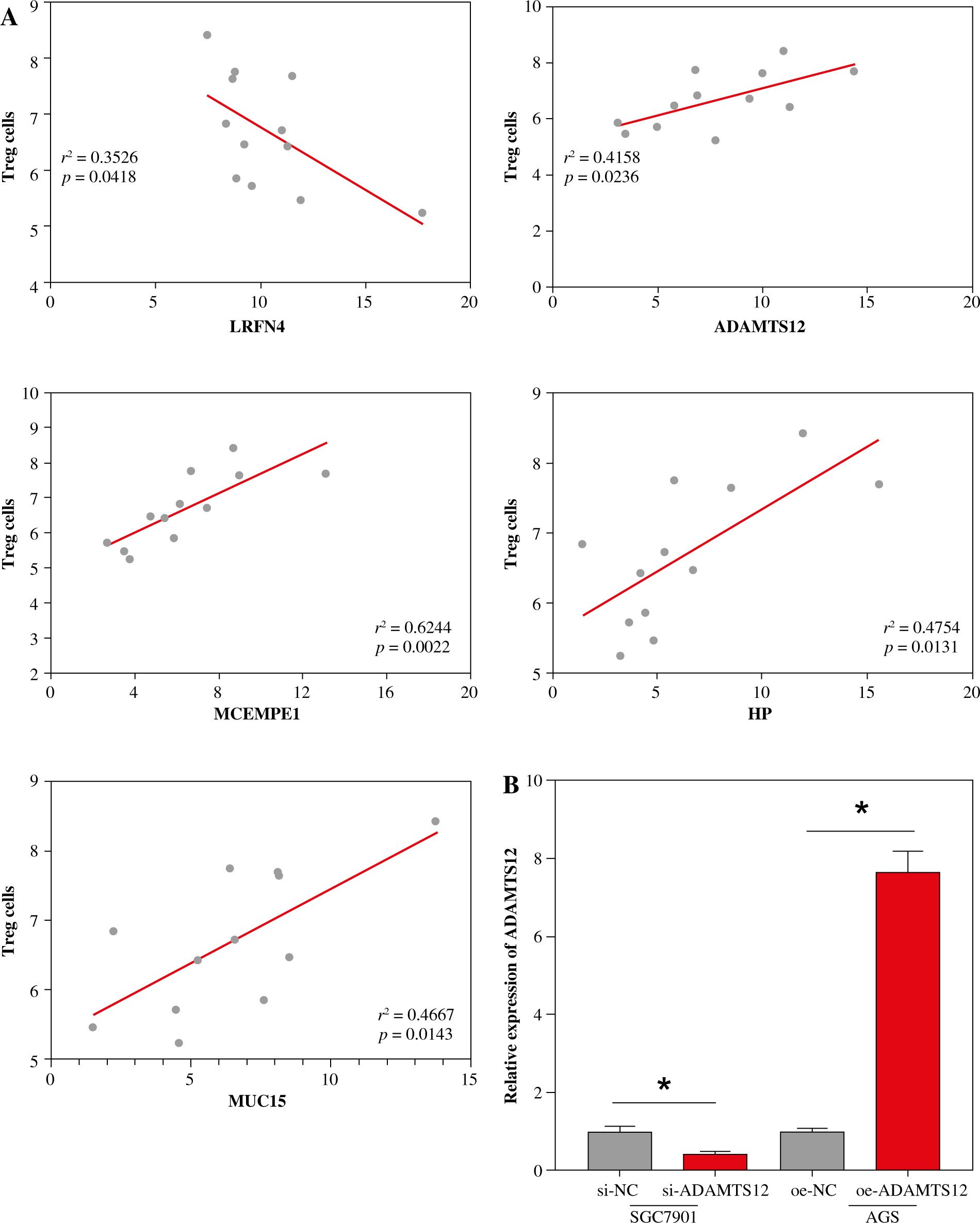 Effect of Treg-related genes on gastric cancer (GC) progression. A) Correlation analysis between Tregs and expression of Treg-related genes, namely LRFN4, ADAMTS12, MCEMP1, HP and MUC15 by using Pearson correlation; B) Transfection efficiency of oe-NC/oe-ADAMTS12 and si-NC/si-ADAMTS12 assessed by qRT-PCR; *p < 0.05