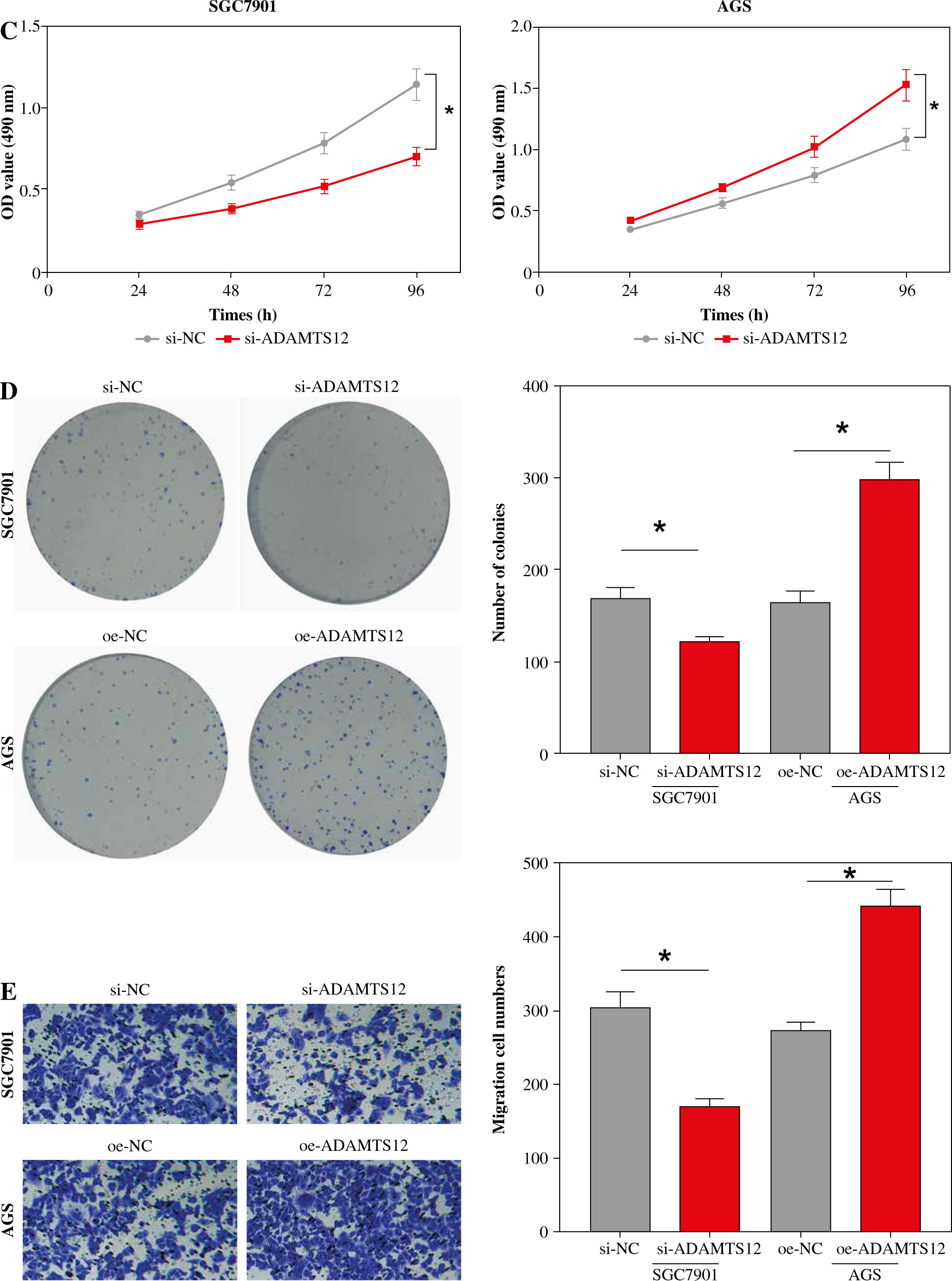 Based on the experimental results in the previous section, the correlation analysis between Treg proportion and the expression of related genes (LRFN4, MCEMP1, MUC15, HP and ADAMTS12) was conducted using Pearson correlation. As shown in Figure 2A, the Treg proportion was found to negatively correlate with LRFN4 expression (r2 = 0.3526, p = 0.0418) and to positively correlate with the other four (p < 0.05). To unveil the role of ADAMTS12 (r2 = 0.4158, p = 0.0236) in GC cells, oe-NC/oe-ADAMTS12 and si-NC/si-ADAMTS12 were transfected into GC cell lines AGS and SGC7901, to construct high-ADAMTS12 and low-ADAMTS12 expression cell lines. By analyzing the transfection efficiency via qRT-PCR, significantly upregulated expression of ADAMTS12 could be observed in the oe-ADAMTS12 group, whereas the si-ADAMTS12 group showed significantly decreased expression of ADAMTS12 (Fig. 2B). According to the results from MTT and colony formation assay, compared with the control group, the oe-ADAMTS12 group presented increased viability and proliferation ability of GC cells, which were inhibited in the si-ADAMTS12 group (Fig. 2C, D). The effect of ADAMTS12 expression on the migration and invasion of GC cells was confirmed by the transwell assay. According to the results, the oe-ADAMTS12 group had enhanced migratory and invasive capabilities of GC cells, while the si-ADAMTS12 group was observed with the opposite results (Fig. 2E, F). The evidence added weight to the observation that, in GC, the proportion of Tregs was positively linked with the expression of ADAMTS12, whose overexpression in promoted the malignant progression of GC.