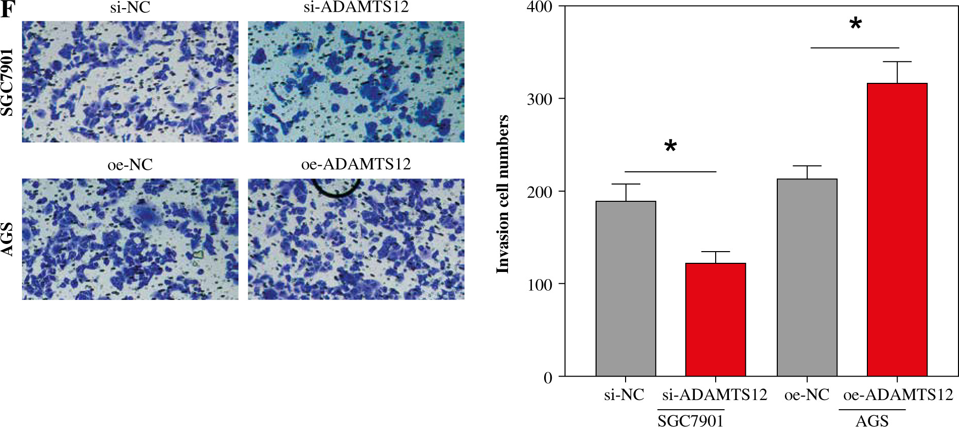 The si-ADAMTS12, oe-ADAMTS12, and negative controls si-NC and oe-NC were synthesized by GenePharma, China. After transfecting the vectors into cells using Lipofectamine 3000 (Thermo Fisher Scientific, USA) following its manual, transfected cells were cultured and then harvested for subsequent experiments.