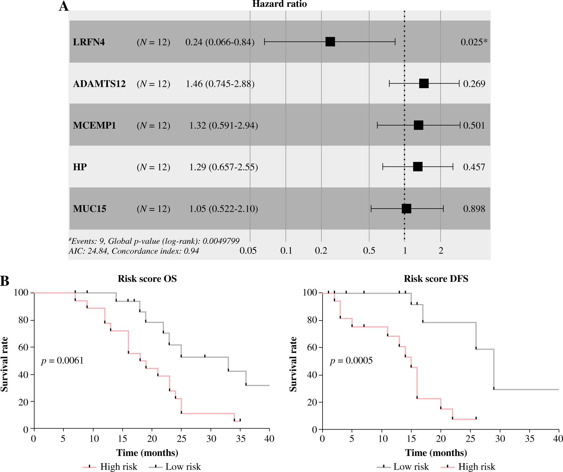 To profile the link between Tregs, Treg-related genes and GC prognosis, we employed Cox regression analysis to build a prognostic model with five Treg-related genes confirmed as prognostic factors (Fig. 3A). Among them, the hazard ratio of LRFN4 stayed below 1, while that of the other four genes was higher than 1. Then, a risk score formula based on the five feature genes was constructed to evaluate the survival risk of the samples according to the expression levels of the five genes: risk score = (1.445558 × LRFN4 expression level) + (0.380839 × ADAMTS12 expression level) + (0.275471 × MCEMP1 expression level) + (0.256952 × HP expression level) + (0.045509 × MUC15 expression level). Based on this established formula, we calculated the score for tumor samples collected from 36 patients. After that, patients were split into high-/low-risk groups by the overall median risk score and followed up for 3 years. As shown in Figure 3B, the low-risk group was found to have notably higher OS and disease-free survival (DFS) (p < 0.05). To analyze the model comprehensively, patients were classified into subgroups by the proportion of Tregs and the median expression level of the five genes. Corresponding survival analyses were plotted by Kaplan-Meier curves (Fig. 3C). According to the results, DFS in the high Tregs group was substantially shorter than that in the low Tregs group. Compared with the corresponding low expression group, the high expression group of LRFN4 had longer DFS, but no significant variation in OS. ADAMTS12 and HP low expression groups had longer DFS. No significant variations were observed in OS and DFS between high and low MCEMP1 and MUC15 expression groups. Although there was no significant correlation between single genes and patients’ OS, the risk score obtained based on these 5 Treg-related genes was significantly correlated with patients’ prognosis (OS and DFS), suggesting that the 5-gene signature might be a prognostic marker for GC patients.