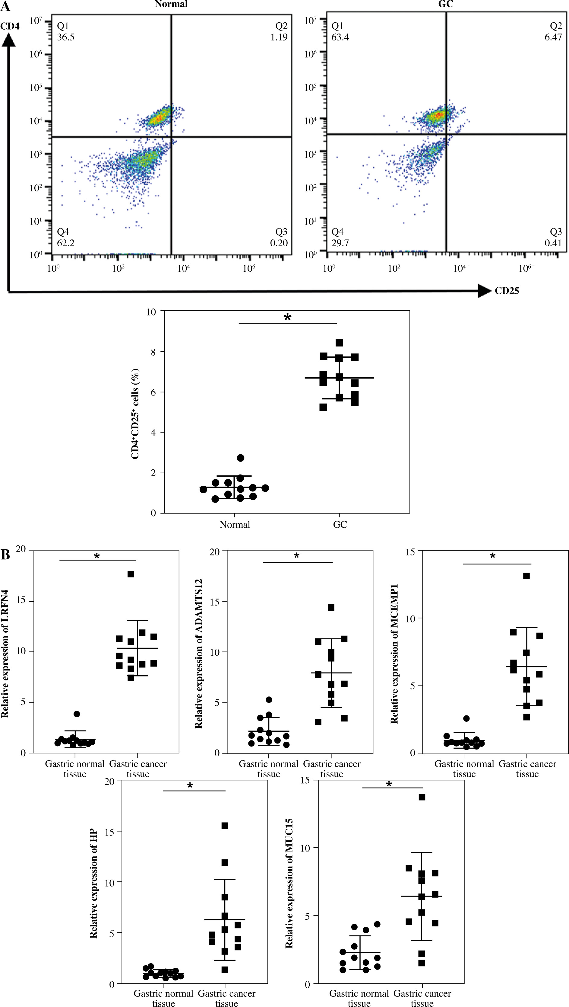With surgically resected tumor tissues and adjacent non-cancerous tissues obtained from 12 GC patients, flow cytometry results revealed that the proportion of CD4+CD25+ Tregs was evidently higher in GC tissues (Fig. 1A). Previous studies have found that five Treg-related genes, namely LRFN4, ADAMTS12, MCEMP1, HP, and MUC15, are strongly associated with GC prognosis [14]. Hence, we employed qRT-PCR to assess their expression in GC tissues. The experimental results showed notably increased expression of five Treg-related genes in GC tissues (Fig. 1B). All clinical statistics are shown in Table S1.